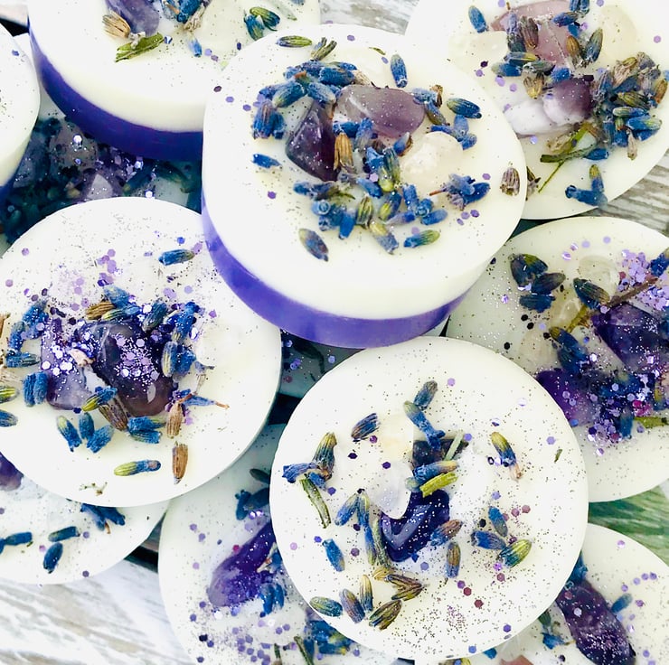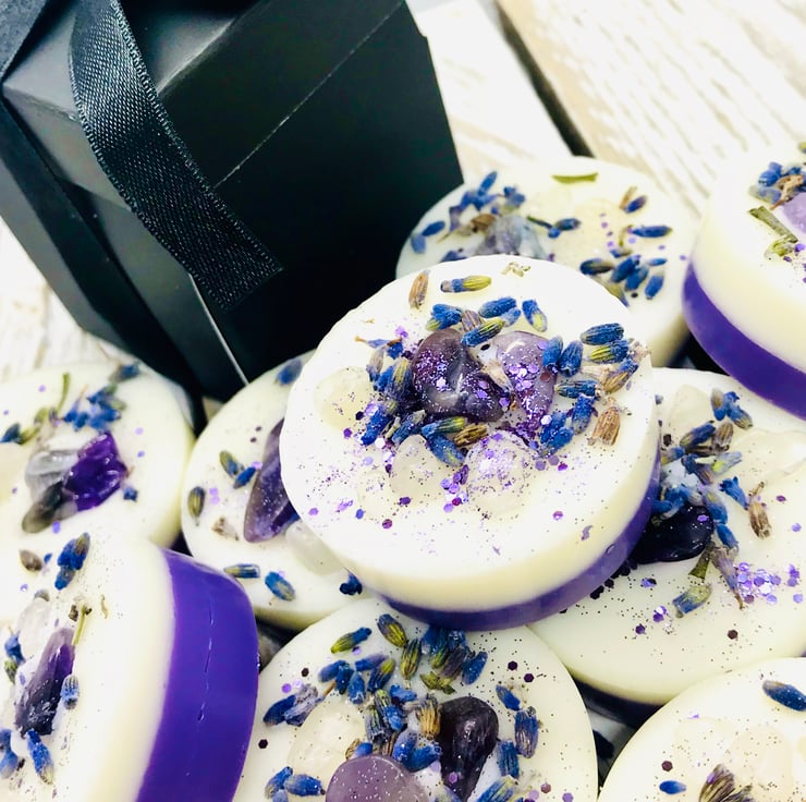 The 100% Natural Soy Wax Tart is embedded with Rose and Clear Quartz, Flourite and Amethyst healing crystals and stones and a sprinkling of botanicals which compliment the spa inspired fragrance.