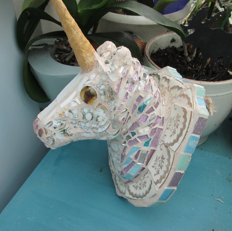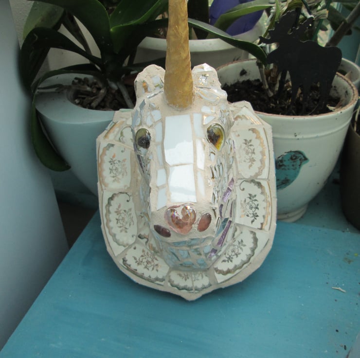 This Unicorn mosaic is made on a 3d base and looks like a trophy hung on the wall. It has gold and beige pottery and a golden horn. The base is 16cm x19cm in size.