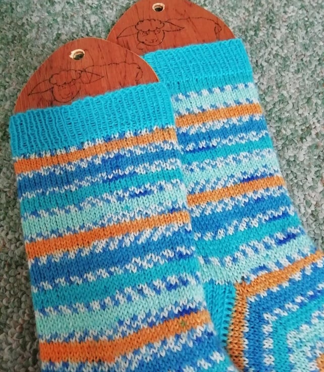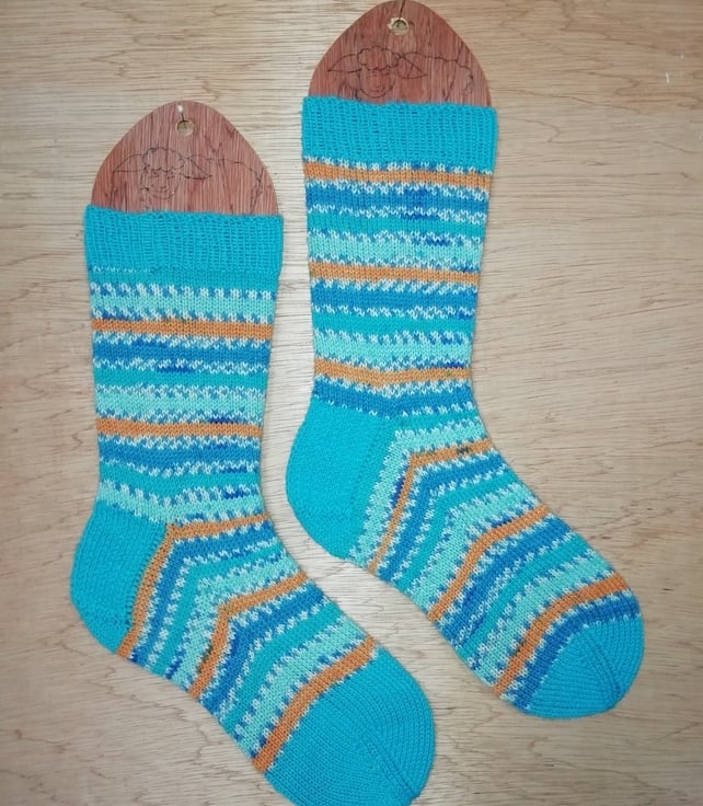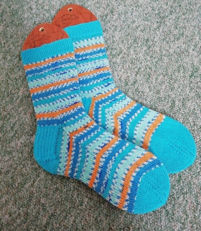 These socks are hand knitted using traditional methods on five double pointed needles. They are made using a durable and comfortable 4 ply yarn comprising of 75% wool and 25% polyamide ensuring comfort and strength. The yarn is British wool dyed in a colour-way inspired by kingfishers.