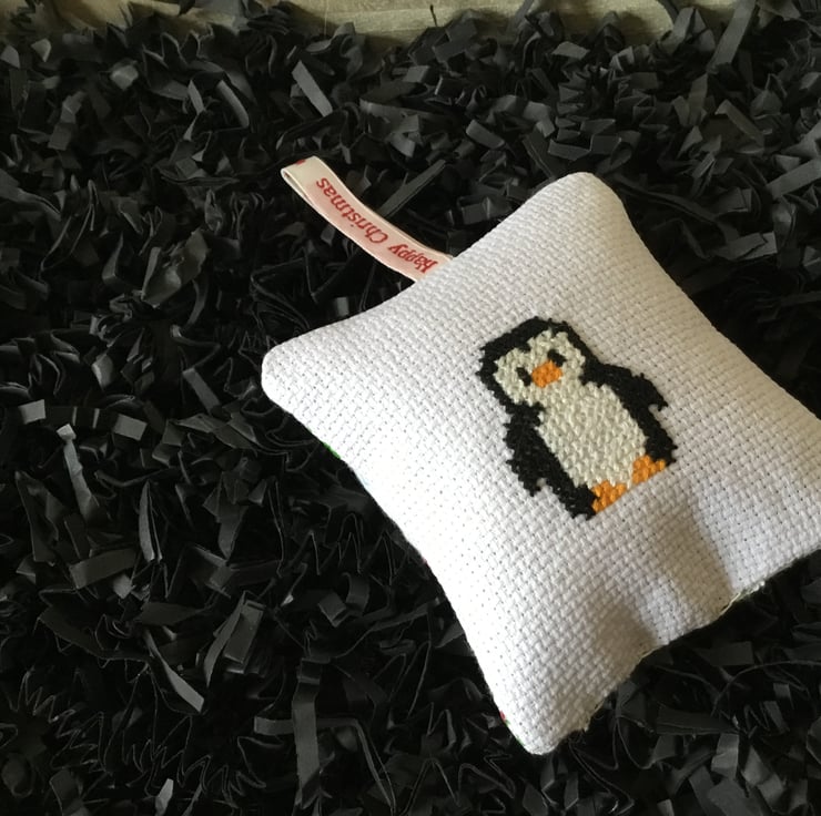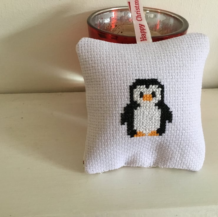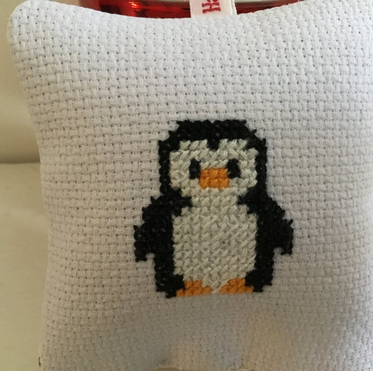 A cute cross stitch Decoration with penguin standing handsomely on the front.