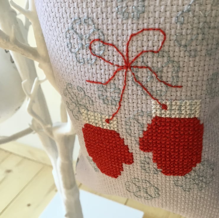 A pair of mittens and snowflakes all lovingly made in cross stitch.