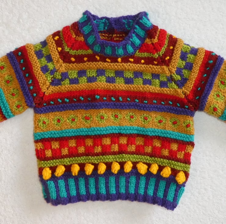 This is a pattern for a raglan baby jumper I have designed for you to knit. The jumper is in 2 sizes, to fit either an 18" or 20" chest, and uses small quantities of 7 different colours of premium acrylic double knitting yarn. Two different colourways are suggested, but feel free to improvise and use colours of your choice. There is a back button band, so you will also need 2 (3) buttons.
