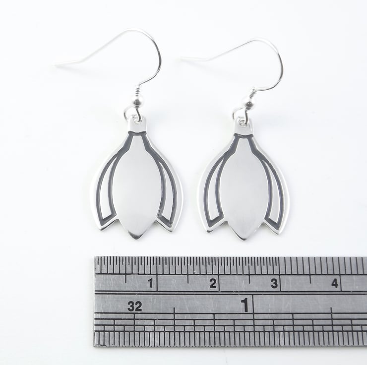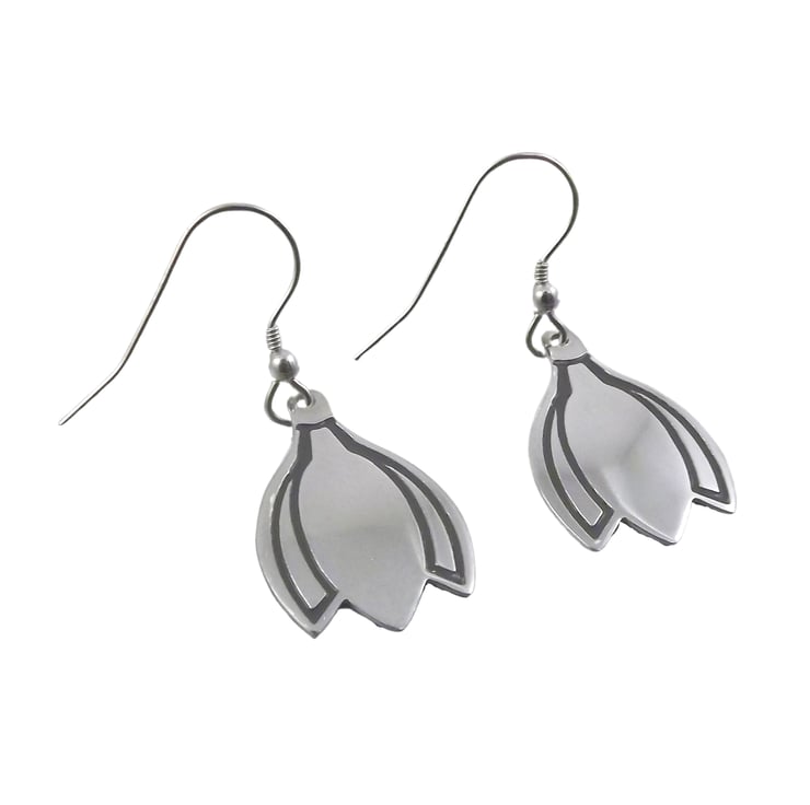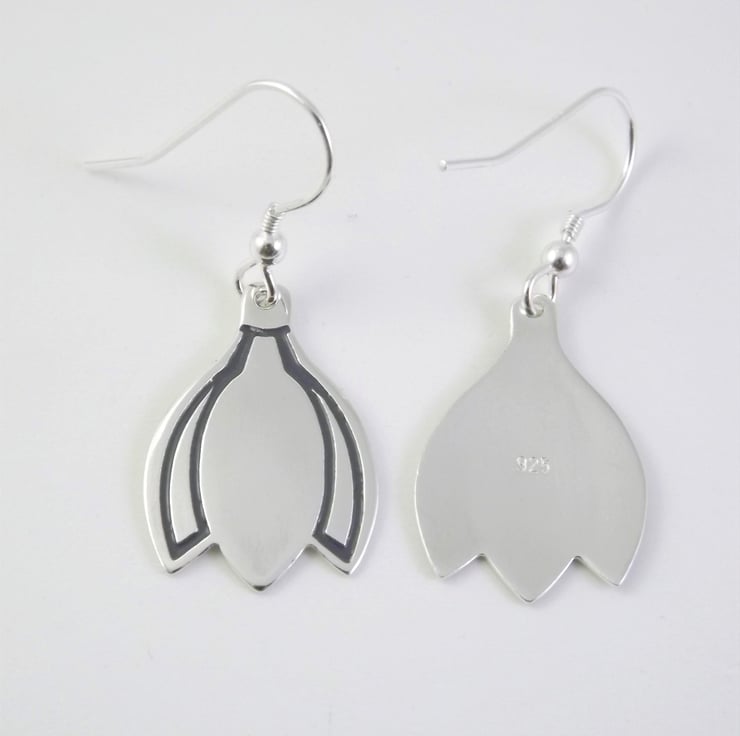 These snowdrop drop earrings have been made from sterling silver sheet and is etched before being cut out by hand. The edges are then smoothed using files and emery paper before they're given their shape using a punch and hammer. A grey resin based enamel is added to the etched areas and then the earrings are polished. Finally, the snowdrops are attached to ear wires.