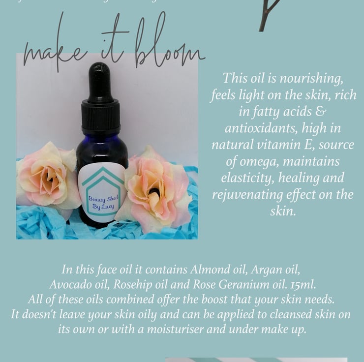 In this face oil it contains Almond oil, Argan oil, Avocado oil, Rosehip oil and Rose Geranium oil.