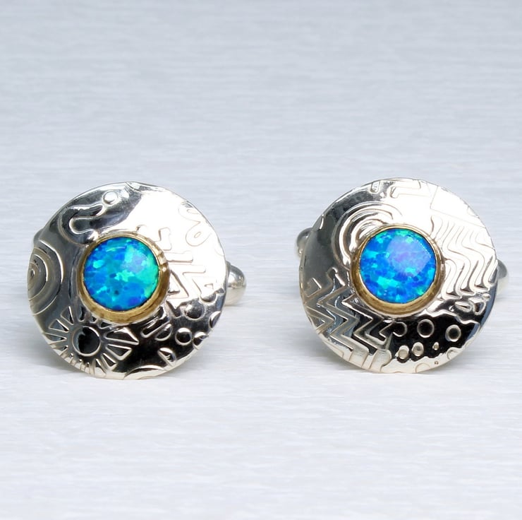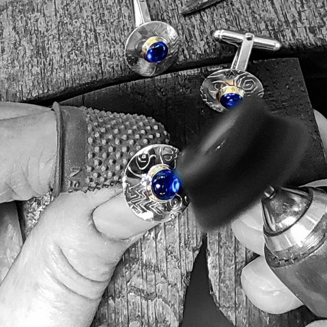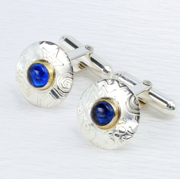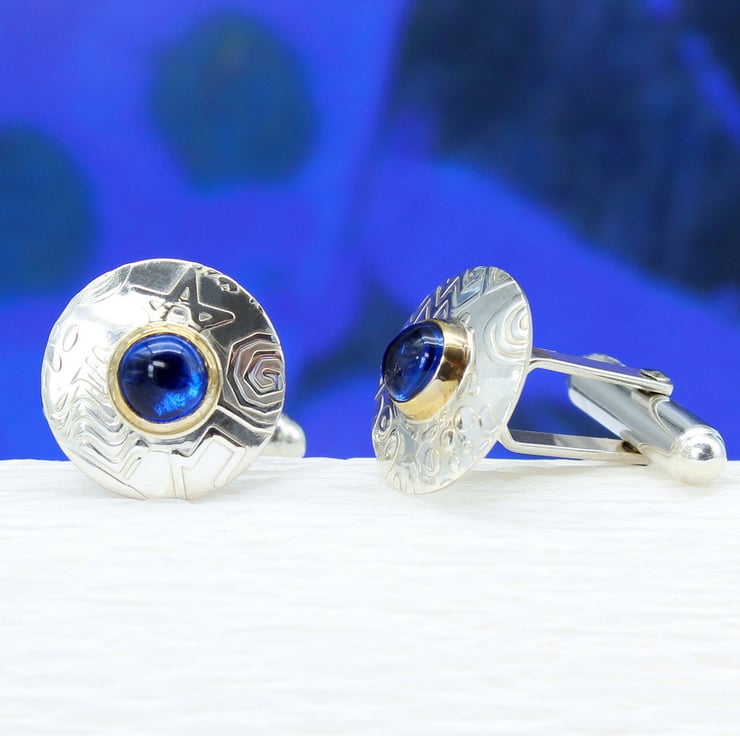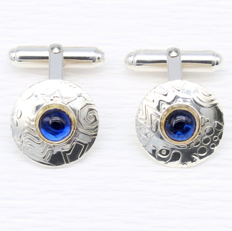 These contemporary round cufflinks have been designed and handmade by us, in our workshop in Yorkshire. They are made from sterling silver and feature two 6mm blue spinel gemstones set in brass bezels and the cufflinks are slightly domed in shape. They measure 16mm in diameter and because they are made by hand the pattern will vary slightly from the ones shown, making each pair of cufflinks unique. They are set onto two quality, double-hinged, sterling silver cufflink backs.