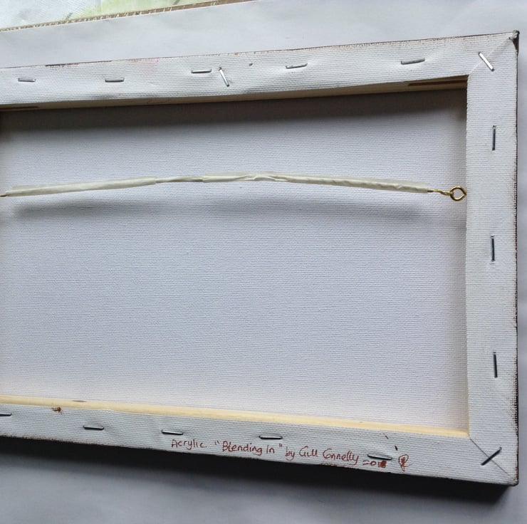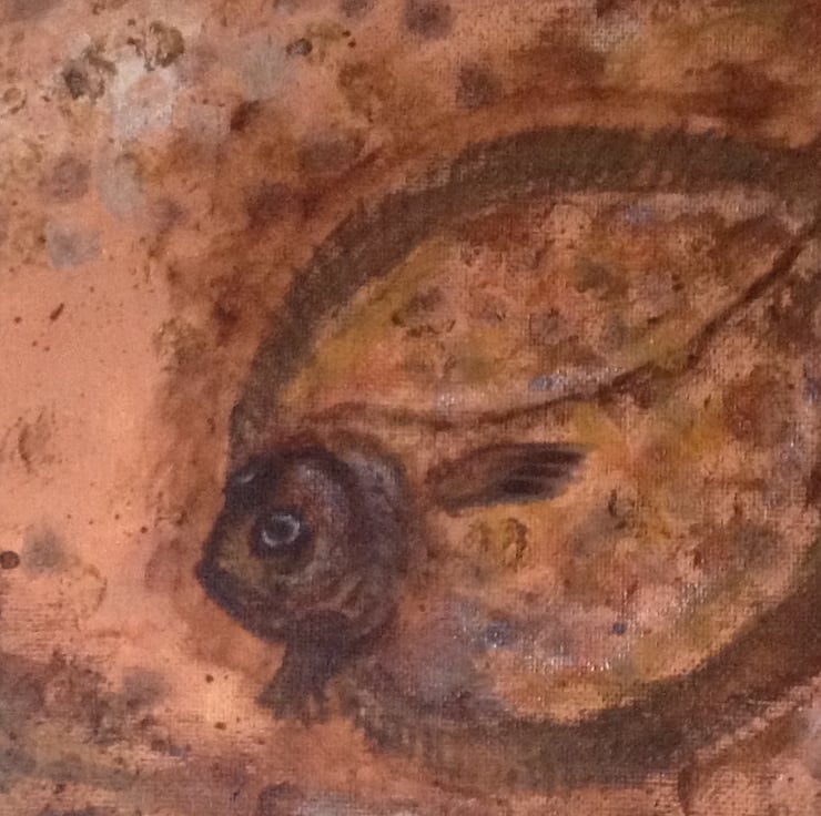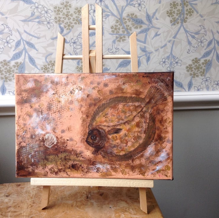 This small painting measures 30 x 20 cms (12" x 8" approx) and is unframed. The edges of the canvas are 1.5 cm deep and have been painted in dark brown to offset the main painted area. It shows a flat fish blending with the background on the seabed, but the colours used are my interpretation of an under water scene. It is signed on the back and is strung ready to hang on your wall. It will be carefully packaged using recyclable material where possible. Postage is free to UK destinations.