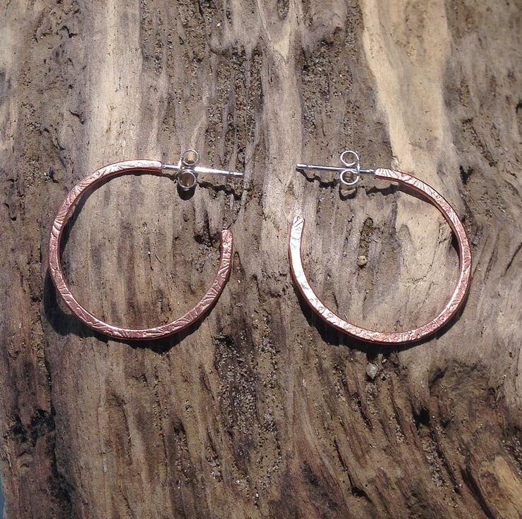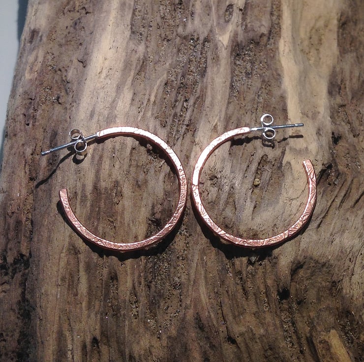These beautiful handmade copper hoop earrings have a hammered and attractive stamped pattern.