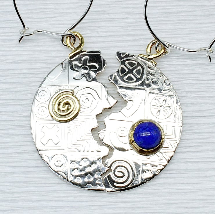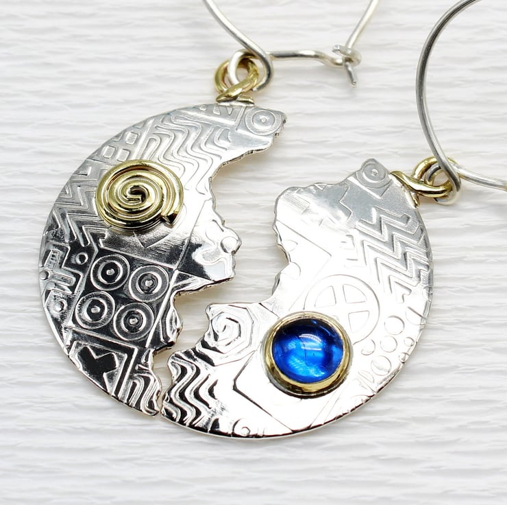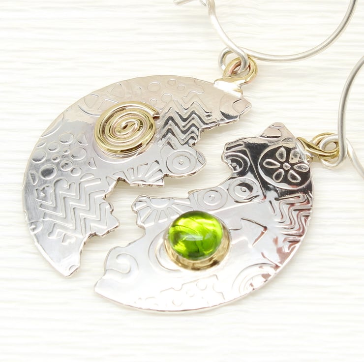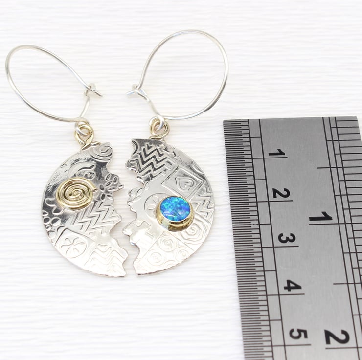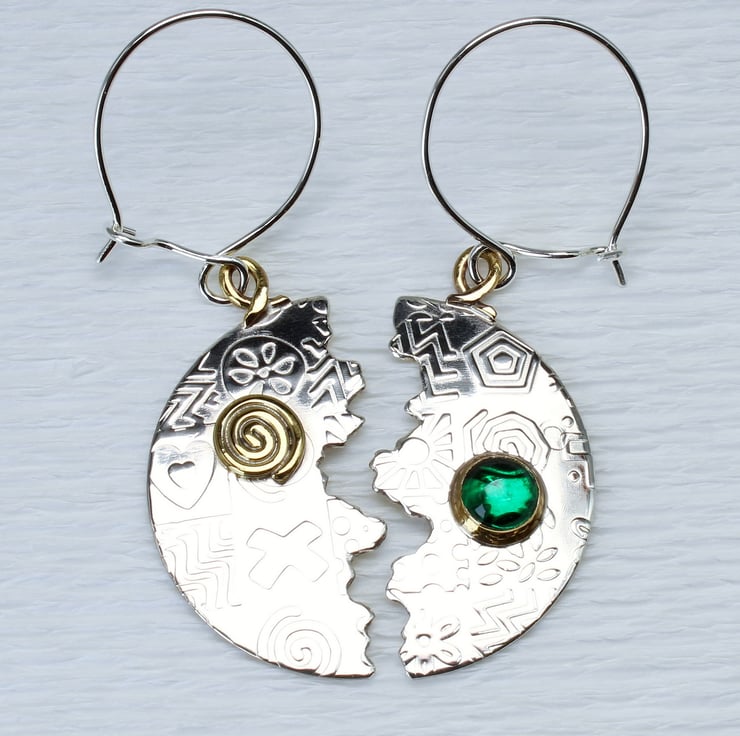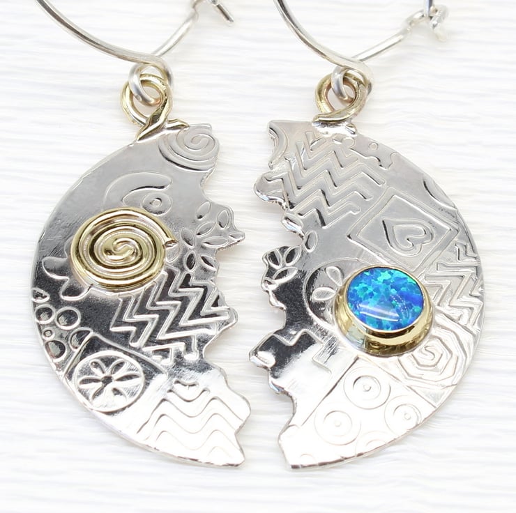 These contemporary, halved earrings are from our latest range of jewellery, simply called the 'Round' range. They are made from sterling silver and this pair features one of our wonderful, 6mm lab. grown red opal triplet stones on one earring and a decorative brass swirl on the other. We have designed the pattern that is hand embossed into the silver and because these halved earrings are made by hand, the pattern will be similar but will vary slightly from the ones shown. These asymmetrical earrings measure 30mm in diameter, when together and they are slightly domed in shape. The ear wires are also made by us from sterling silver.