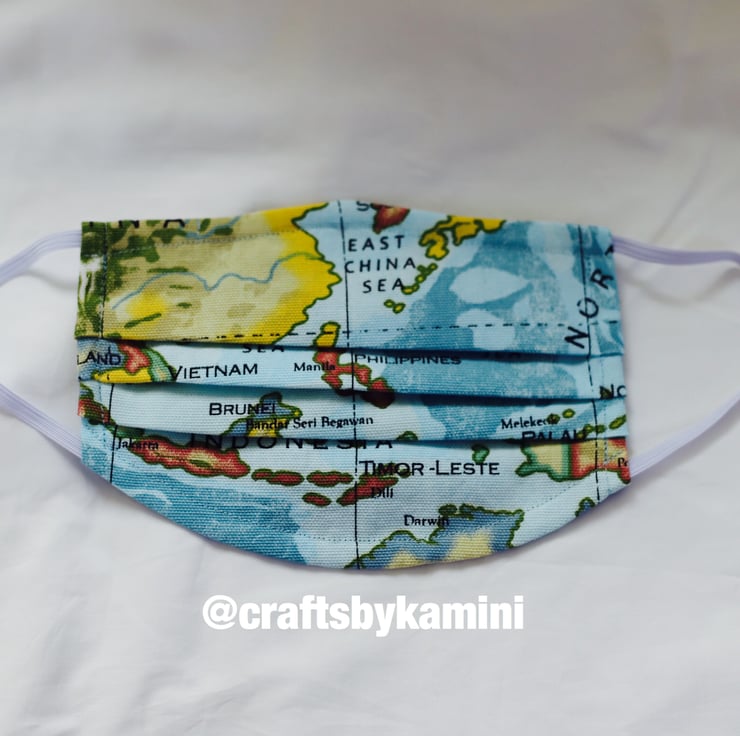 This face covering is made from 100% cotton world map fabric, with a blue-turquoise back.