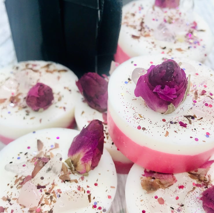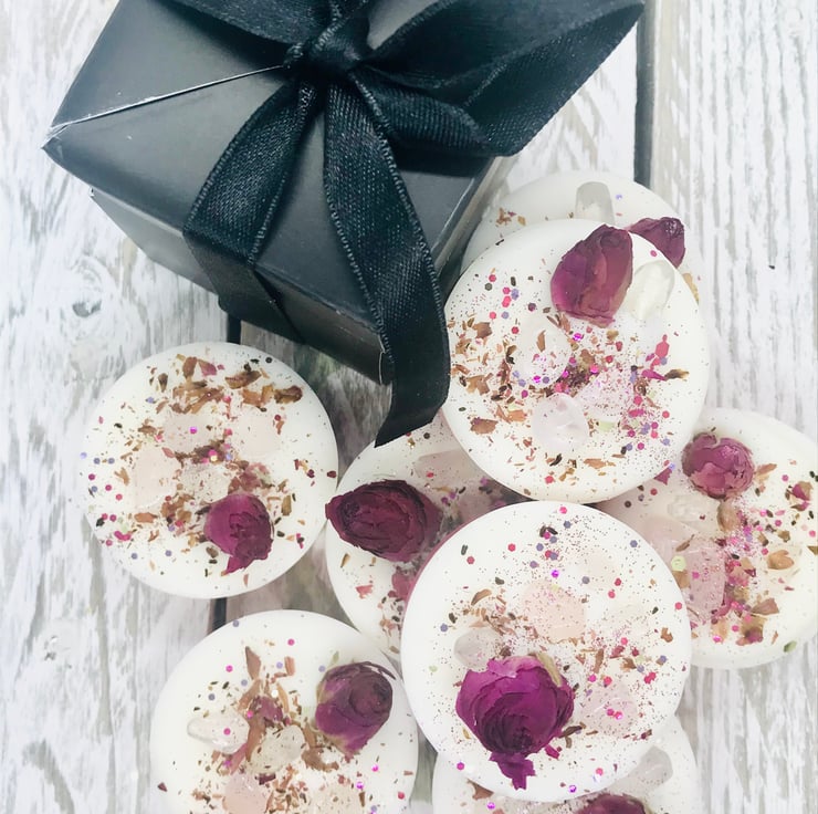 Our Rose Quartz & Copper Wax Melt Tart is embedded with Rose and Clear Quartz and Flourite healing crystals and stones, with a sprinkling of botanicals which compliment the spa inspired fragrance.