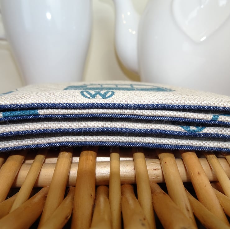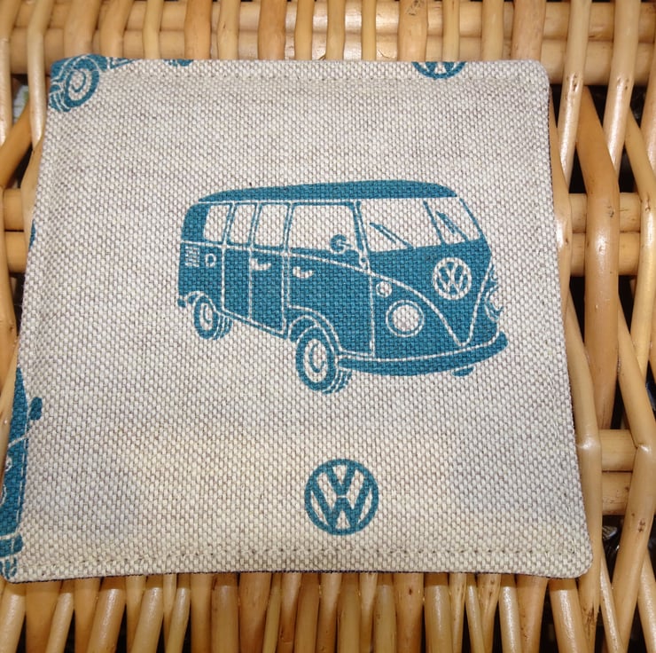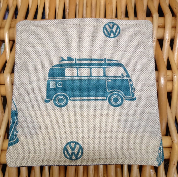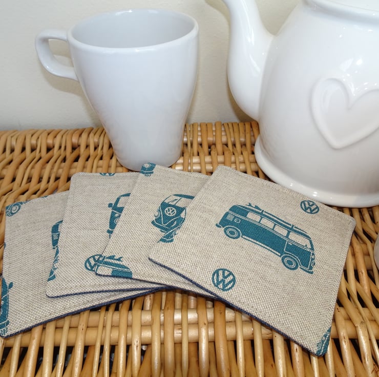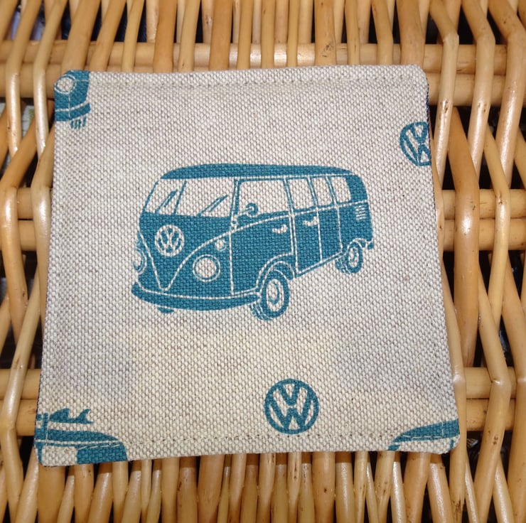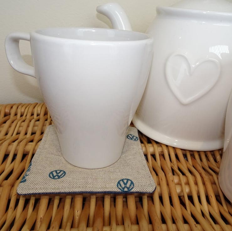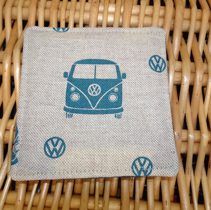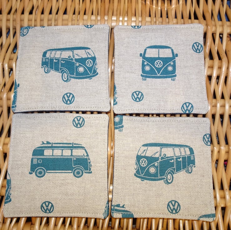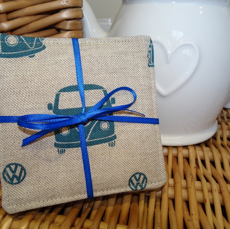 A set of 4, fabric, retro blue campervan coasters to liven up any tea time. No more cups sticking to the bottom of hard coasters! These coasters measure approximately 90mm by 90mm (9cm by 9cm) and consist of three layers; the main fabric, a thin layer of wadding inside and a lining of a denim look, thin cotton. This makes them soft and tactile to the touch. Can also be used to stand pot plants on or other items where you want to protect surfaces. The 4 coasters are bound together with gift ribbon measuring 750mm (75cm) in royal blue.