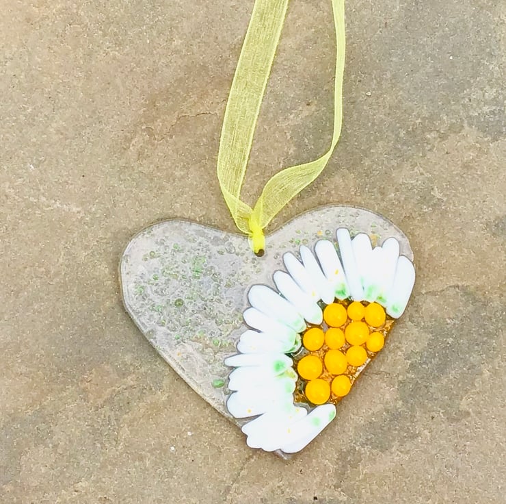 A heart approximately 10cm x 8cm. Drilled and strung with ribbon . An attractive glass hanging decoration . Perfect as a small gift or to adorn your home . I profuse tiny squares to make the beads I then use for the daisy centre . I then snip white opaque petals and a heart shape assemble and fusee for around 14 hours