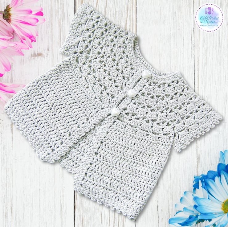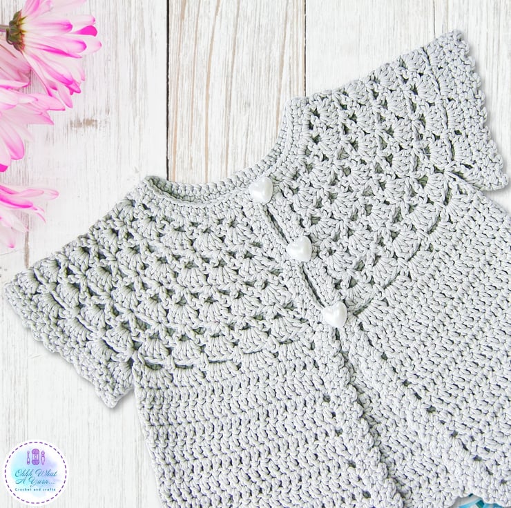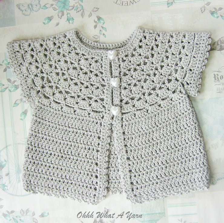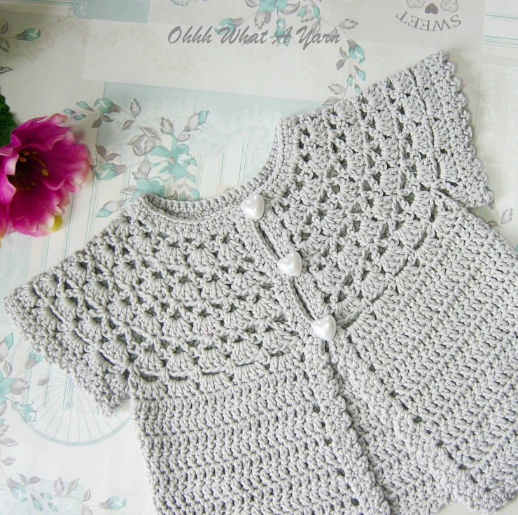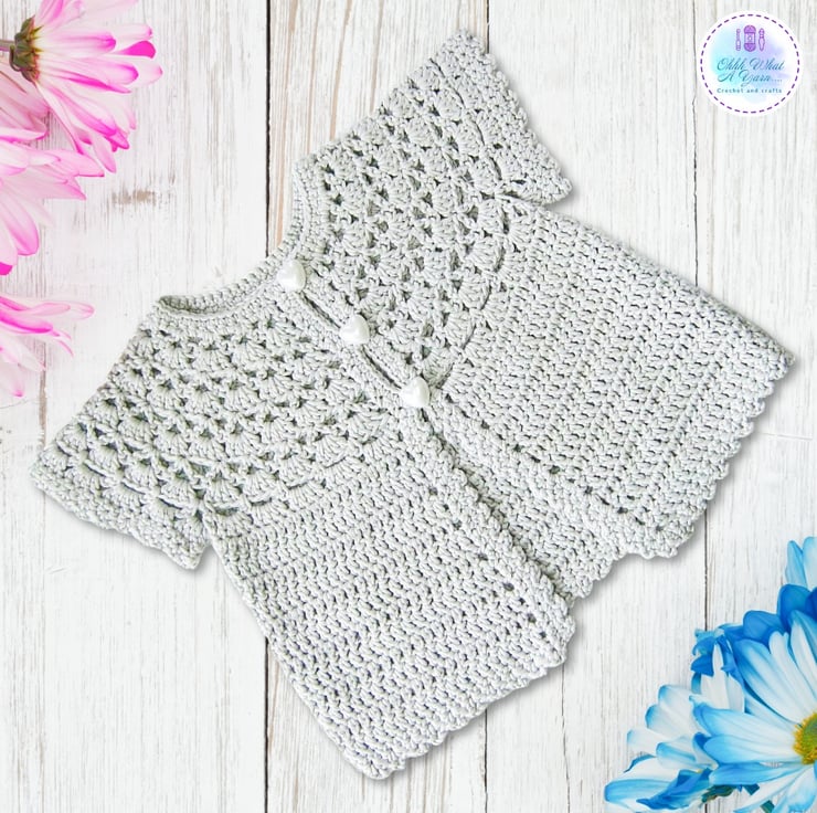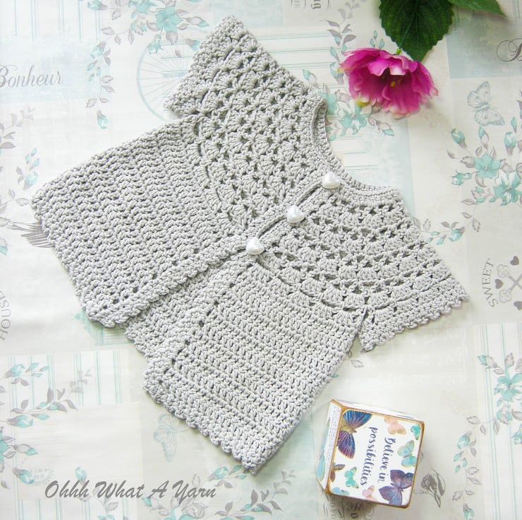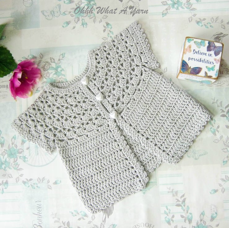 This pretty lacy cap sleeved baby cardigan has been crocheted using gorgeous Drops Muskat 100% cotton yarn.