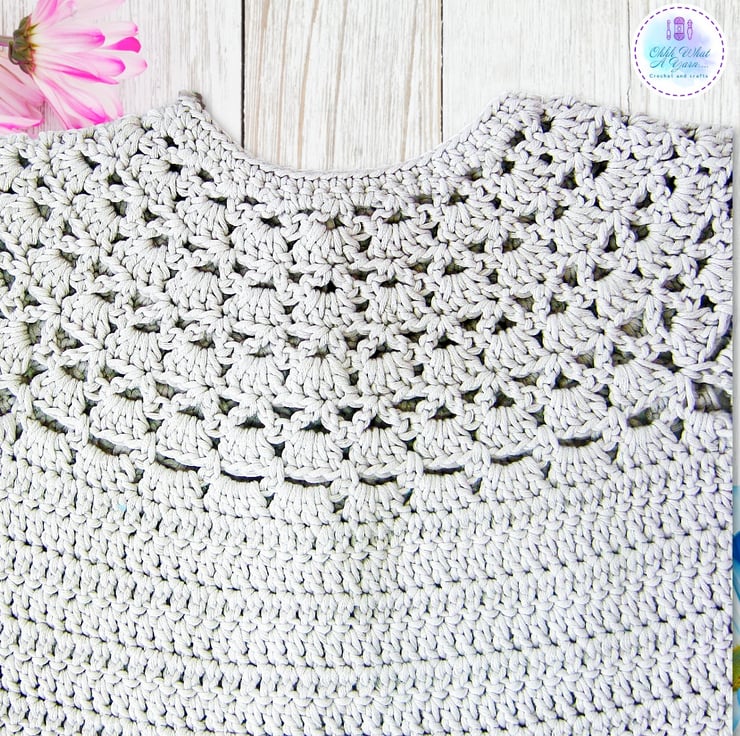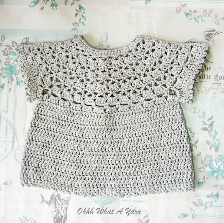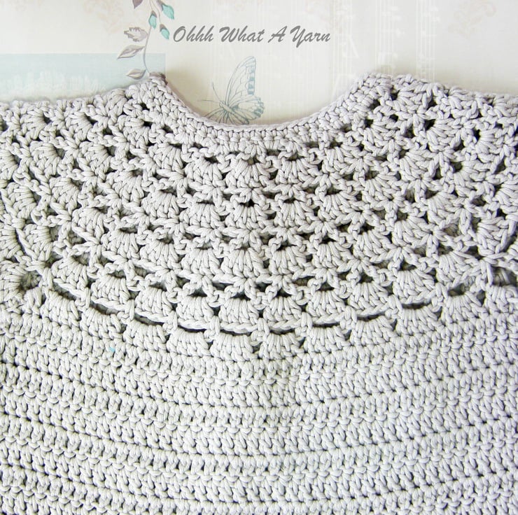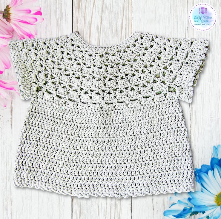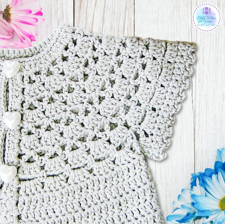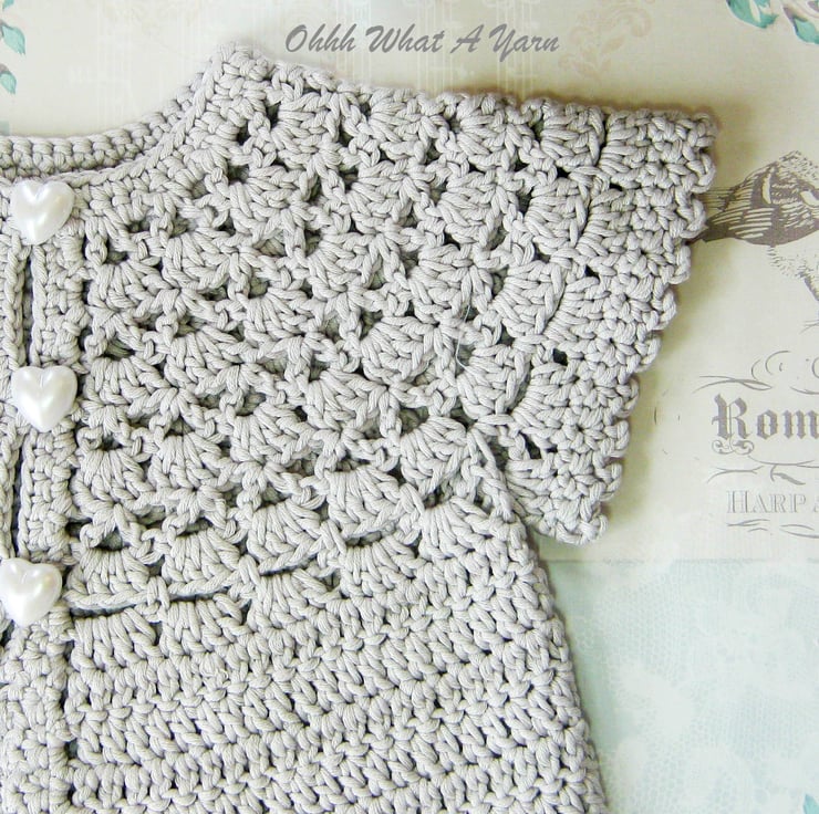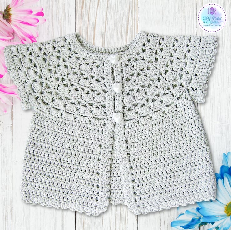 This pretty lacy cap sleeved baby cardigan has been crocheted using gorgeous Drops Muskat 100% cotton yarn.