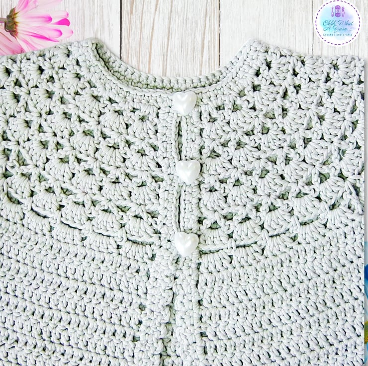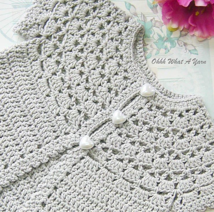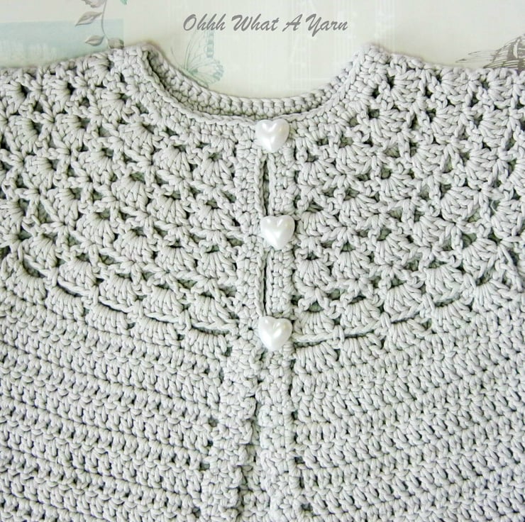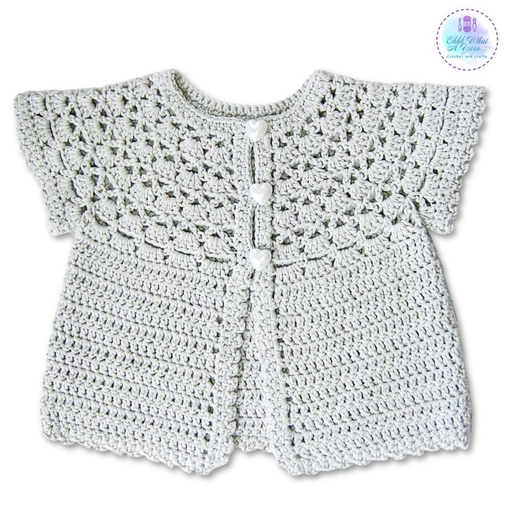 The cardigan has a pretty lacy shell patterned yoke and a picot edging around the sleeves and bottom edging. It fastens with three lovely pearl effect heart buttons.