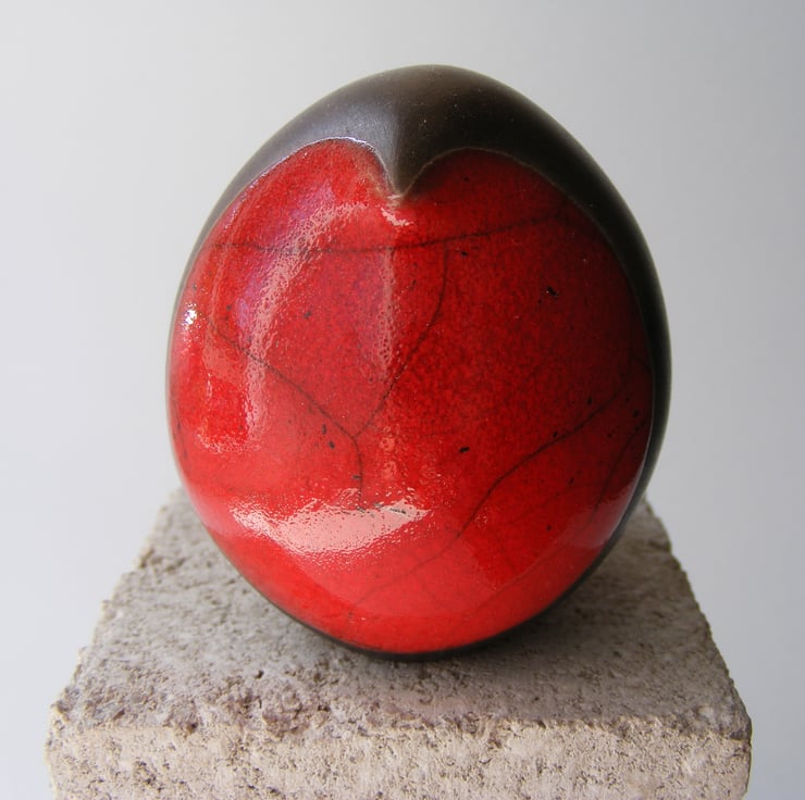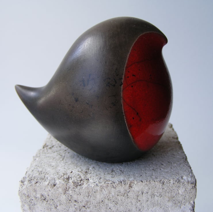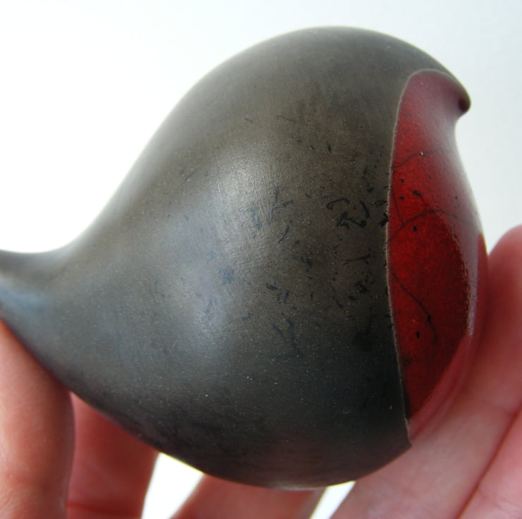 This robin is hand made and measures, approx 6cm high and 6.5cm long. It is made from white earthenware clay and fired first in an electric kiln then the red glaze is painted on and it is raku fired in a gas kiln, the black part of the bird has been sanded and is unglazed and polished with beeswax.