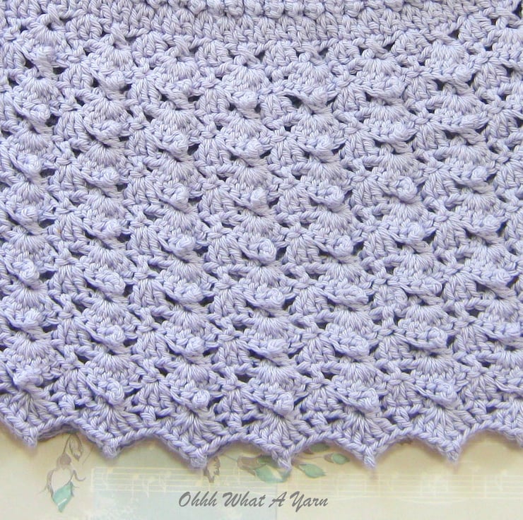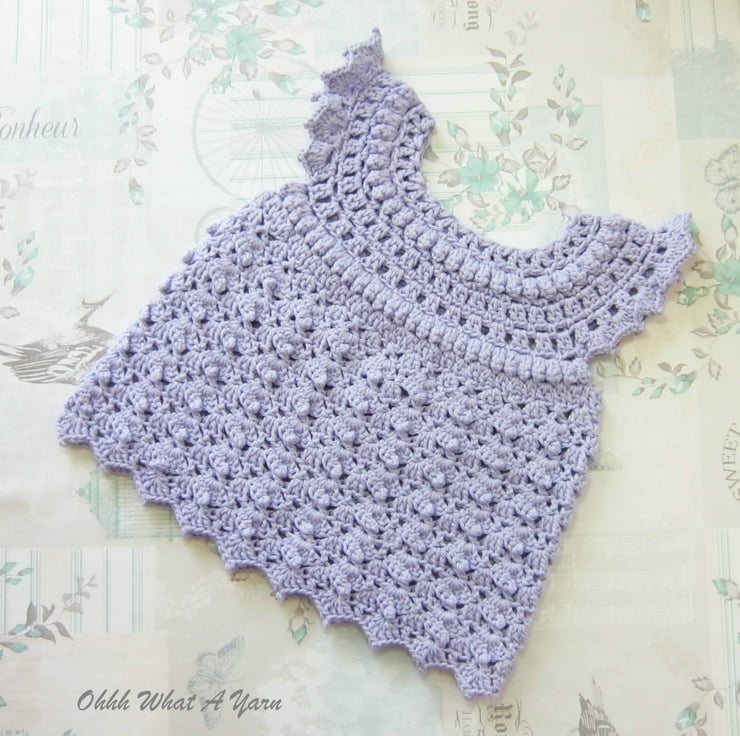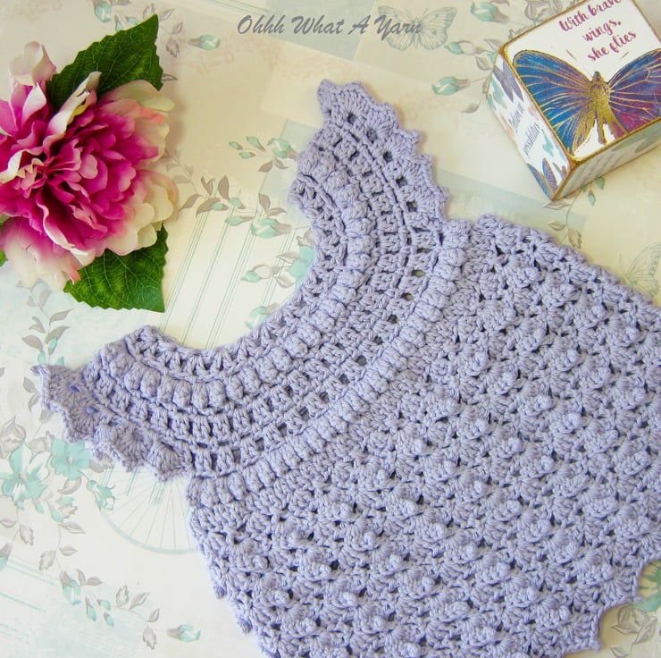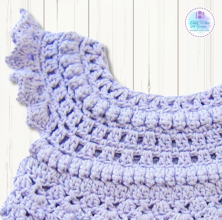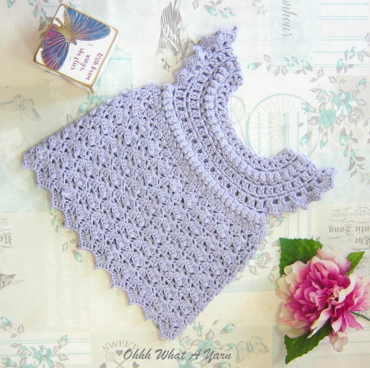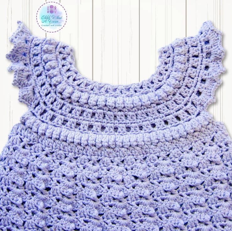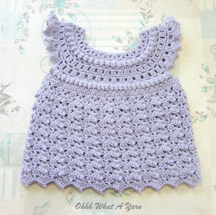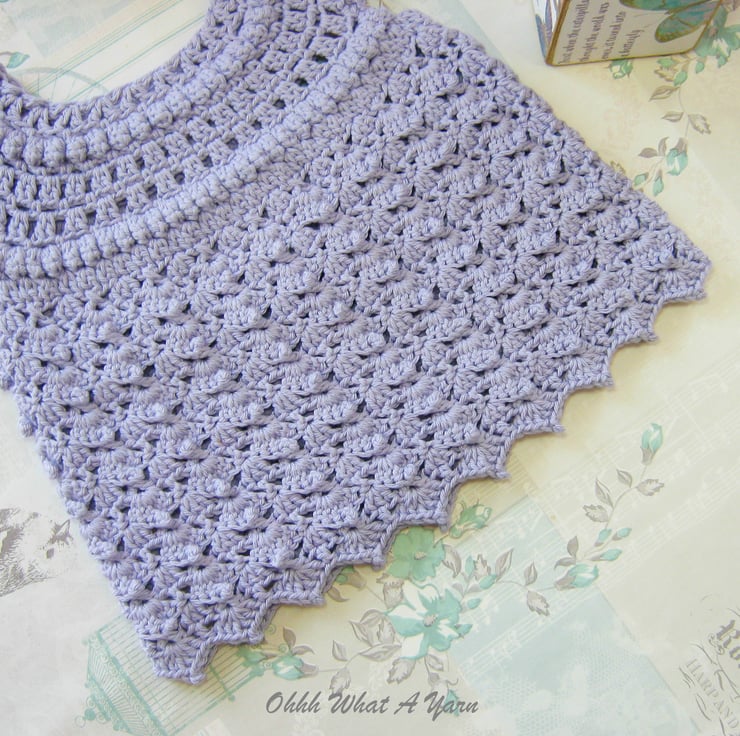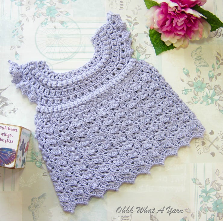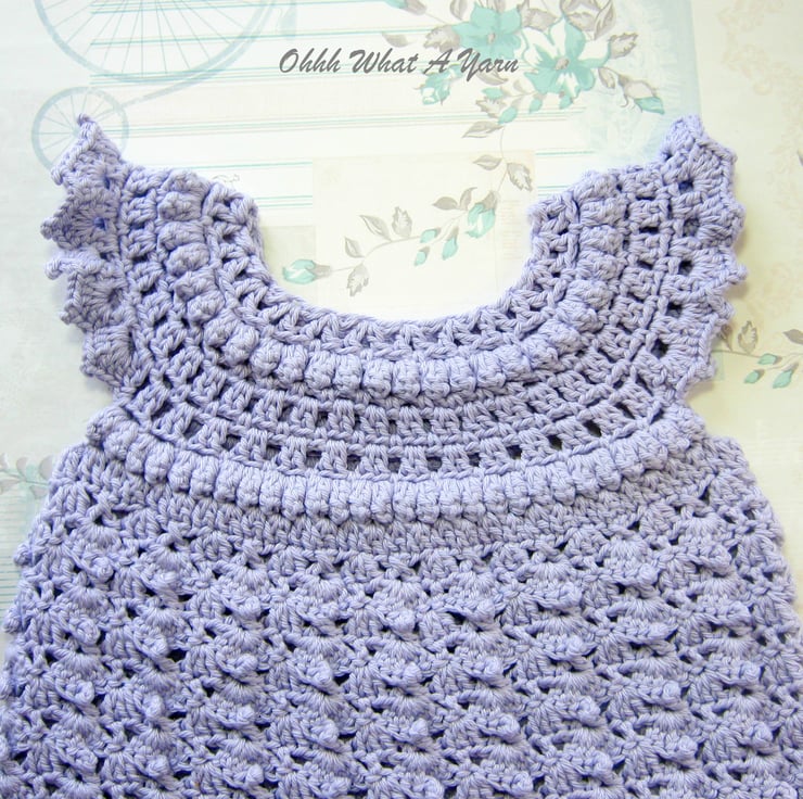 It has a pretty lace and bobble yoke and a picot shell edge around the armholes. The body of the dress has a lovely shell and picot pattern and it has the same picot shell edging along the bottom.