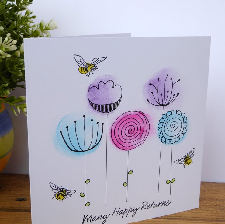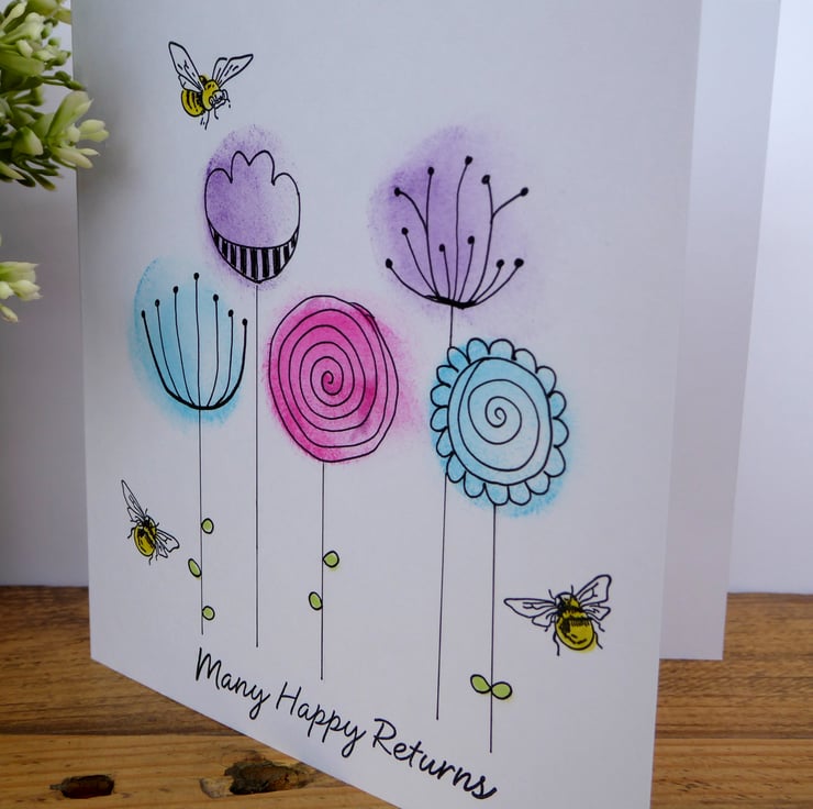Made up a 300gsm white card blank - Inked up some circles then drew some flowers and stamped out the bees. Stamped out a sentiment to complete.