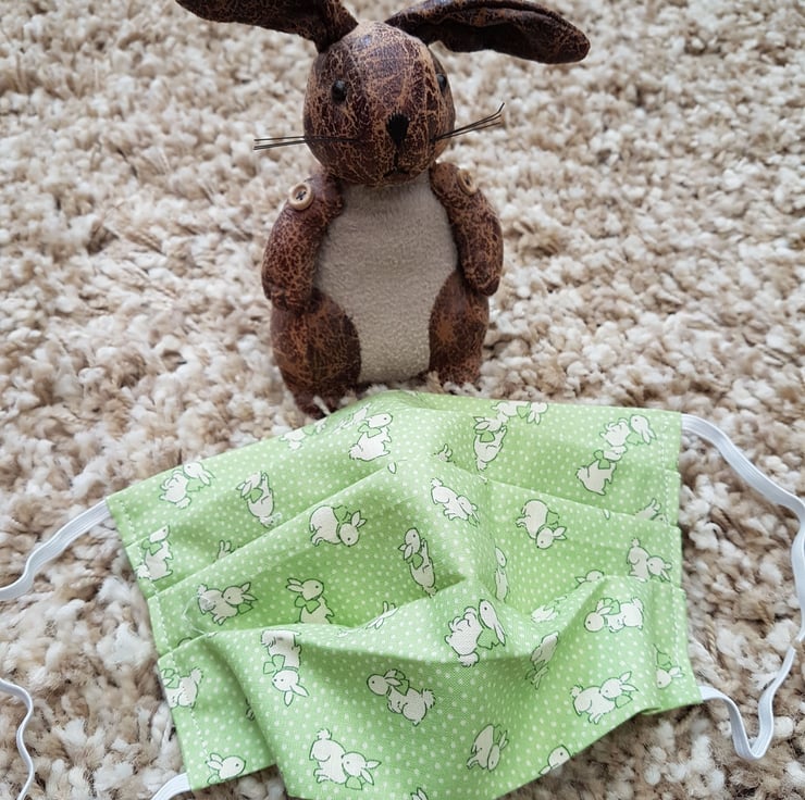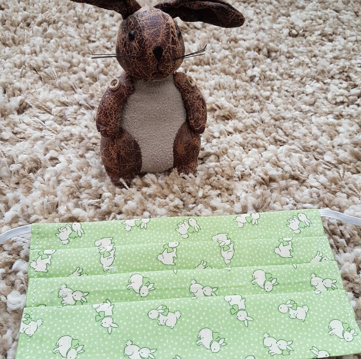 Adult face covering/mask made from a pale green rabbit print cotton. The face mask is made with 2 layers of cotton forming an inner pocket for a filter (not included) and is fastened over the ears with 2 loops of elastic.