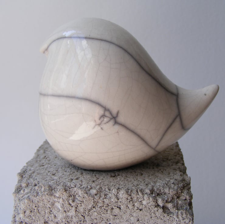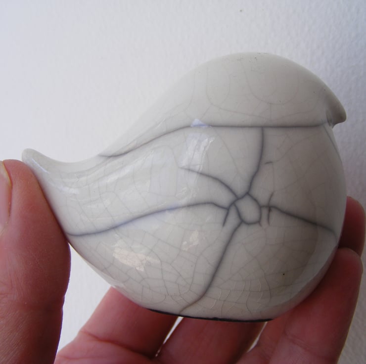 This bird is hand made and measures, approx 5.5cm high and 6.8cm long. It is made from white earthenware clay and fired first in an electric kiln then four layers of clear glaze is painted on and it is then raku fired in a gas kiln and then smoked in a bucket of sawdust which highlights the crazing.