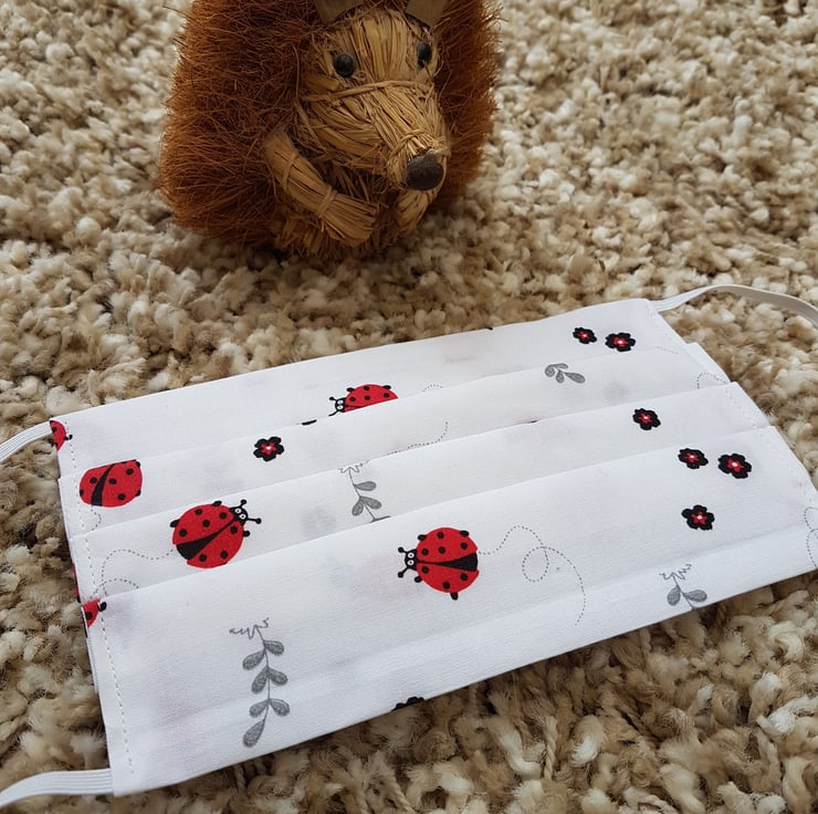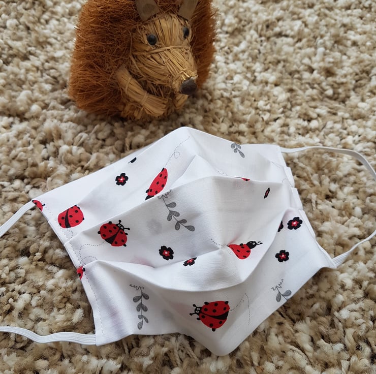 Small Adult/Teenager face covering made from a white ladybird print cotton. The face mask is made with 2 layers of cotton forming an inner pocket for a filter (not included) and is fastened over the ears with 2 loops of elastic.