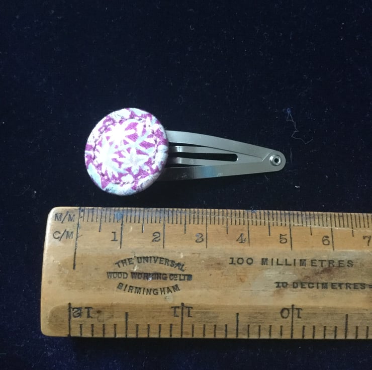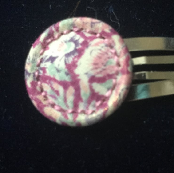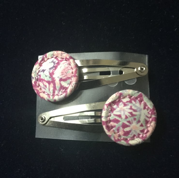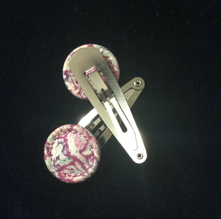 This pretty pair of Dorset button hair clips feature Singleton buttons made with a Liberty print cotton in the pattern ‘Chive’ stitched with a dusky pink coloured cotton thread. The buttons are worked on a 21 mm brass ring and are fixed to the simple snap closing hair clip.