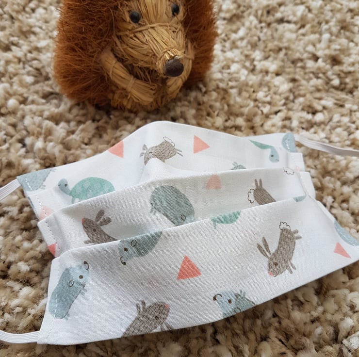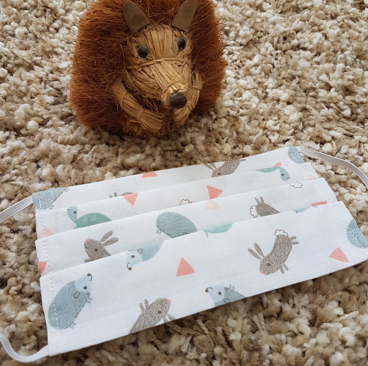 Small Adult/Teenager face covering made from a hedgehog and bunny print cotton. The face mask is made with 2 layers of cotton forming an inner pocket for a filter (not included) and is fastened over the ears with 2 loops of elastic.
