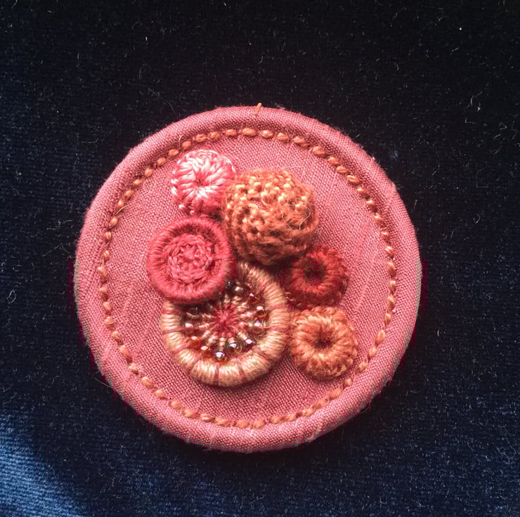 The base is a large (50 mm diameter) Singleton button made using pure silk in a rich mauve shade, which is adorned with a 18mm beaded Cross Wheel button worked in shades of dusky pink and dark red with tiny glass beads, a dark red coloured 15mm Yarell Cross Wheel button, a 15mm Dorset Knob in rich mauve and three small (10mm) simple Bird's Eye buttons in toning shades of dusky pink cotton.