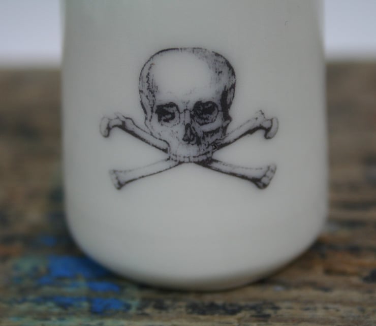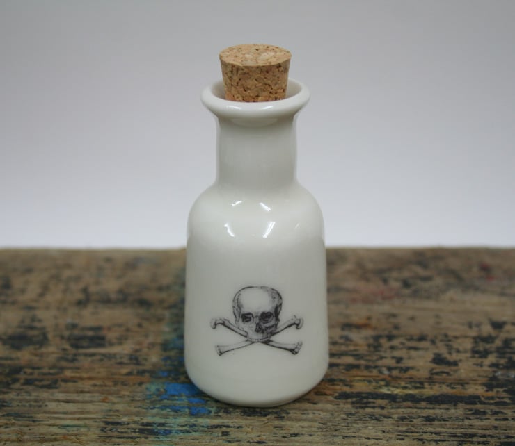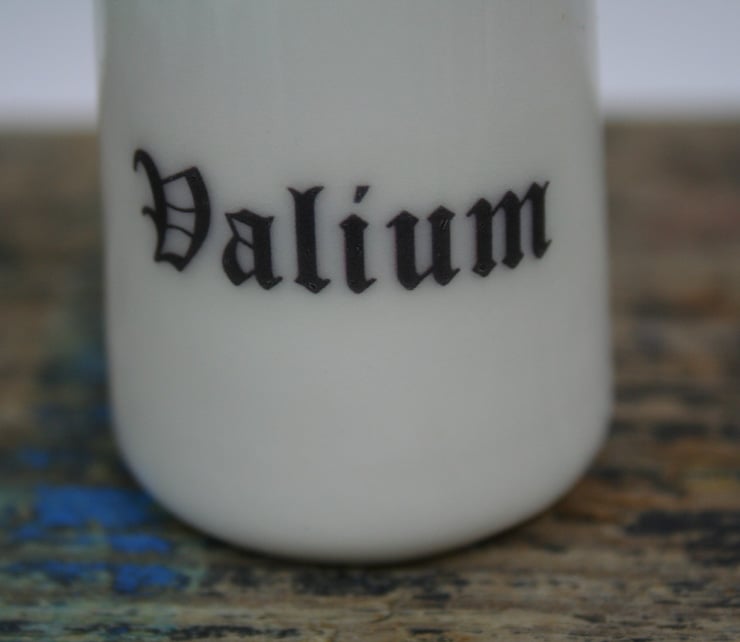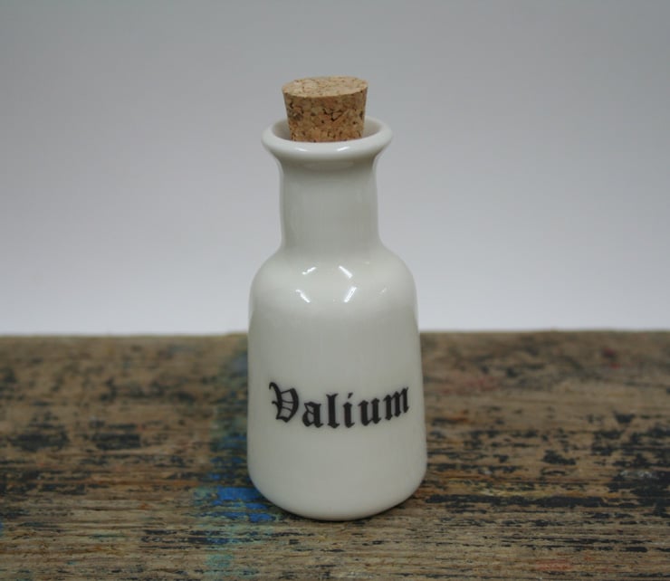 Hand thrown small porcelain bottle with Valium wording and skull and bones image on the reverse. Includes a cork. Approximate size 8.5cm high and 4cm diameter at the base. This is an empty bottle. The item is microwave, dishwasher and oven proof.