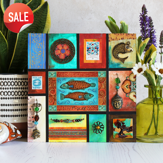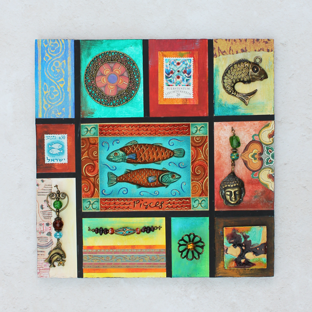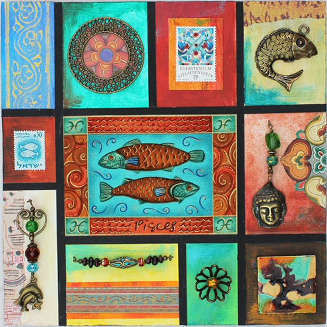 I found some lovely zodiac fabric and have used a section with an illustration of Pisces as the main focus of this board. There are also Pisces themed postage stamps from Lichtenstein and Israel and a small Pisces charm.