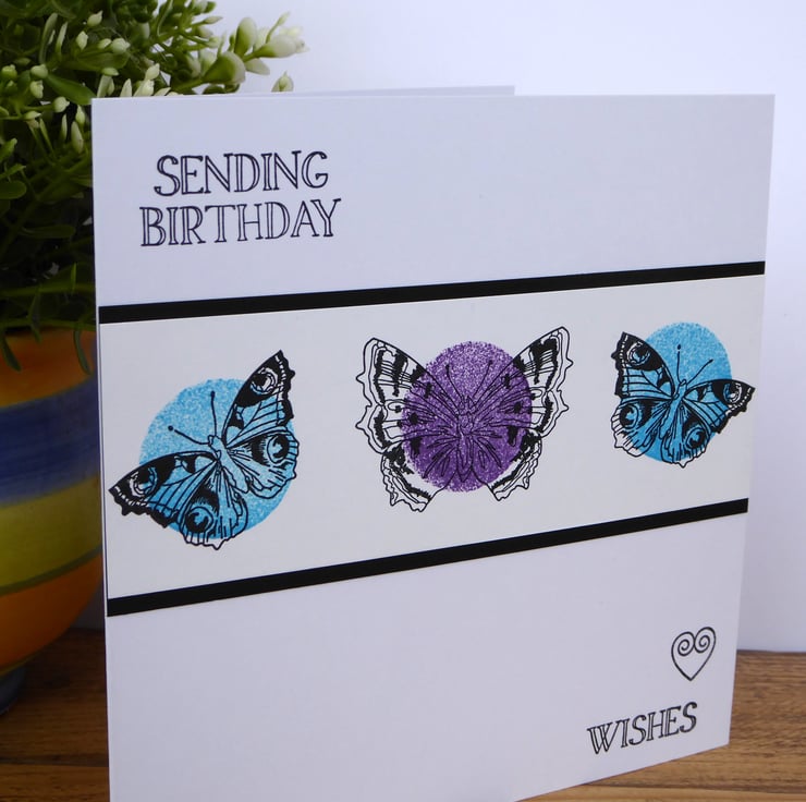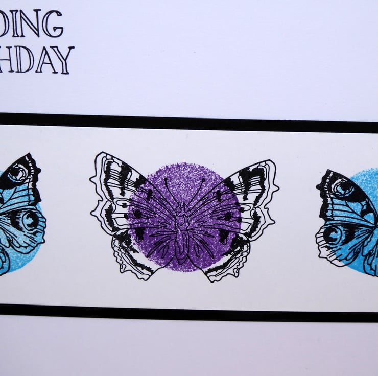 Made a 300gsm white card blank. Cut some card and inked three circles on, stamped a butterfly onto each one. Layered this up onto black card and attached to the base card. Stamped out a sentiment and a small heart to complete.