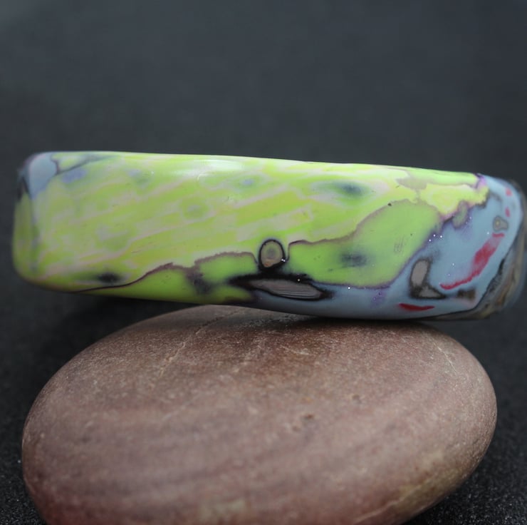This is a unique piece - very original - made by myself and ready to go. It is crafted entirely from polymer clay - excellent lightweight and hard-wearing stuff that will keep those lush tones forever. The bangle has been shined and polished to a high degree.