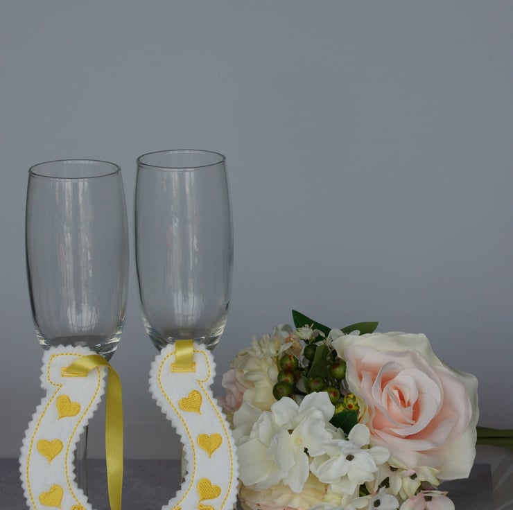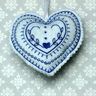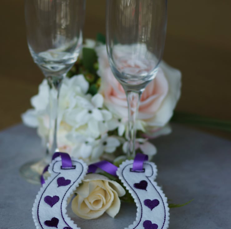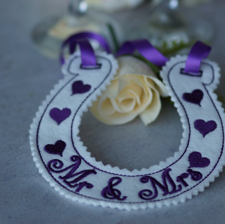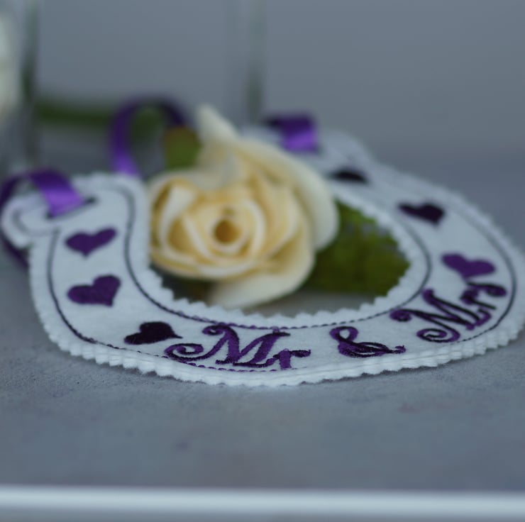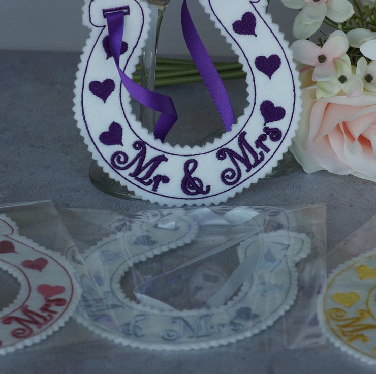 A gorgeous machine embroidered wedding horseshoe with hearts and Mr & Mrs wording, it is embroidered on to white felt and has a matching ribbon