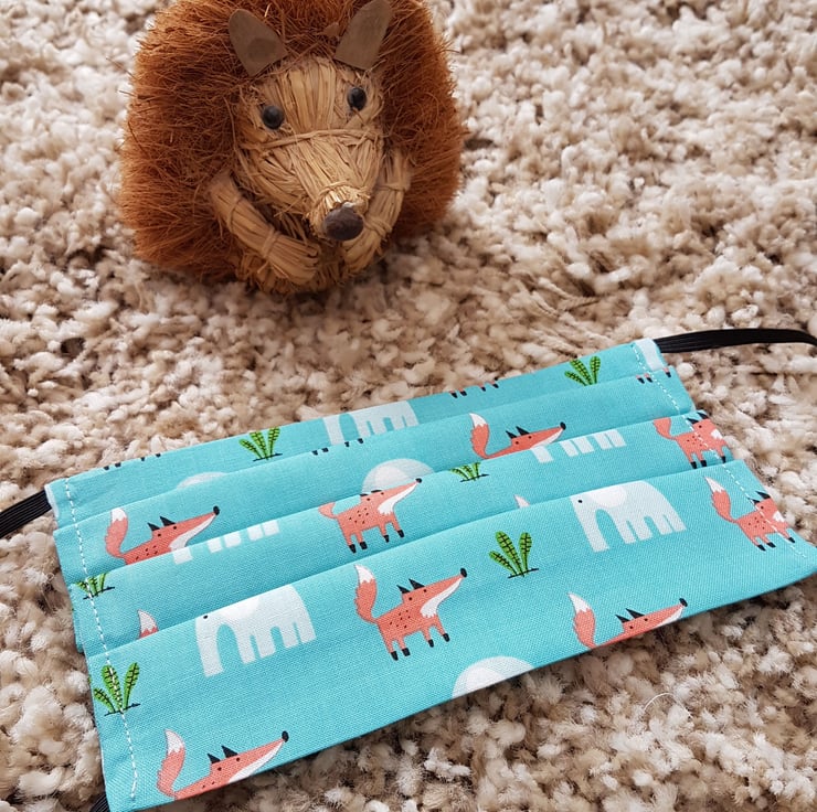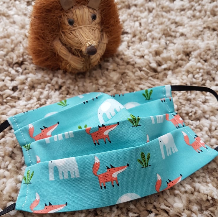 Small Adult/Teenager face covering made from an elephant and fox print on blue cotton. The face mask is made with 2 layers of cotton forming an inner pocket for a filter (not included) and is fastened over the ears with 2 loops of elastic and a toggle adjuster.