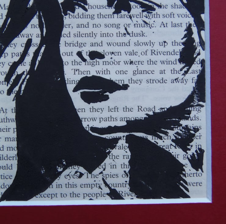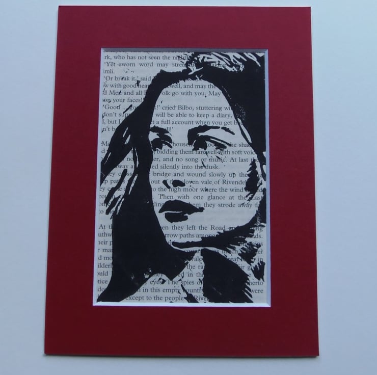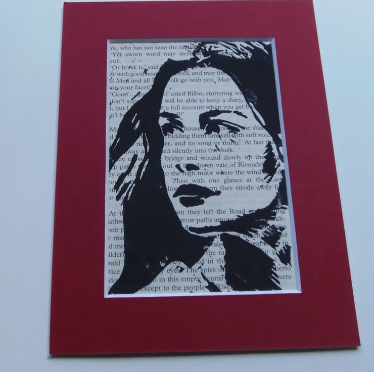 Printed on real book pages from the Lord of the Rings novel, Fellowship of the Ring by JRR Tolkien. This print is a hand cut lino portrait of Liv Tyler as Arwen from the film.