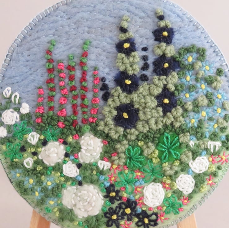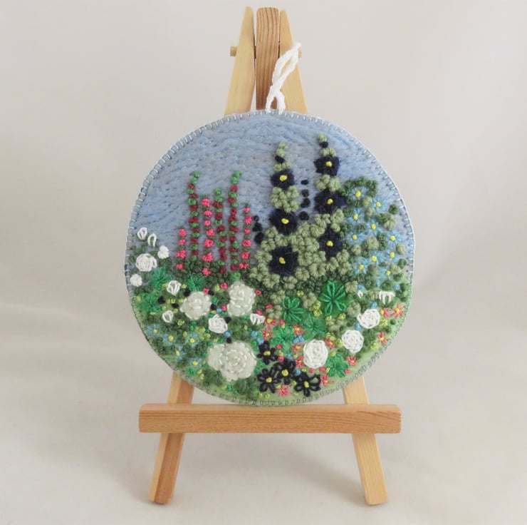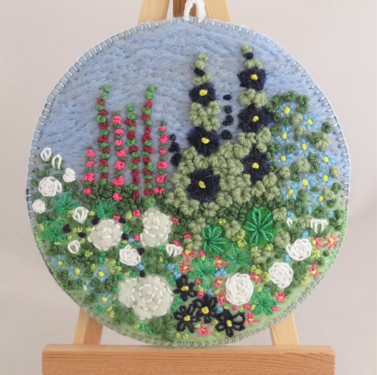 A garden scene with white roses, daisies and delphiniums stitched onto a felted background forms this plaque.