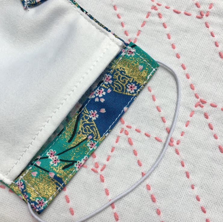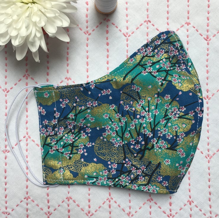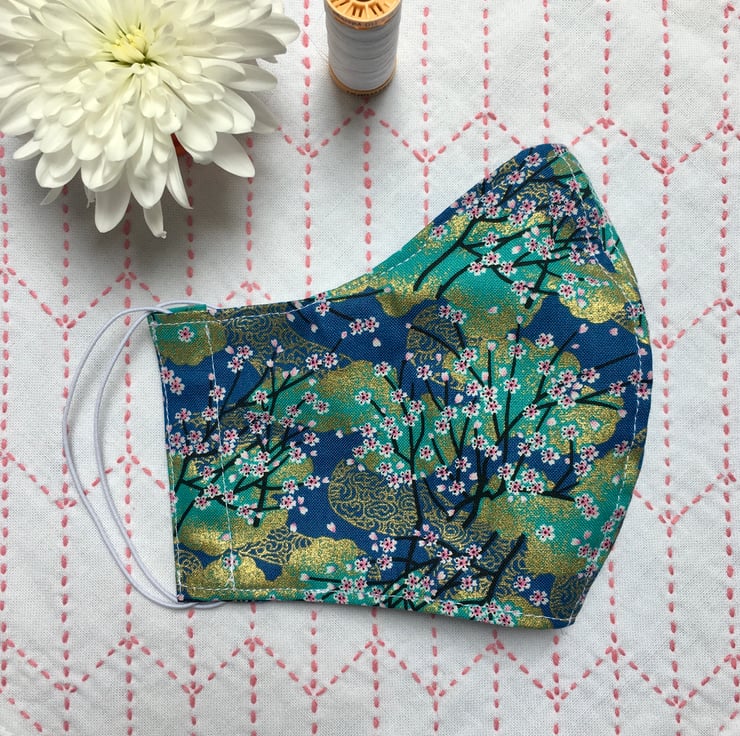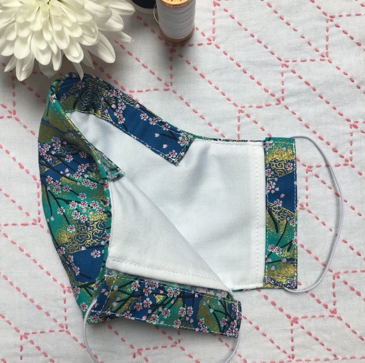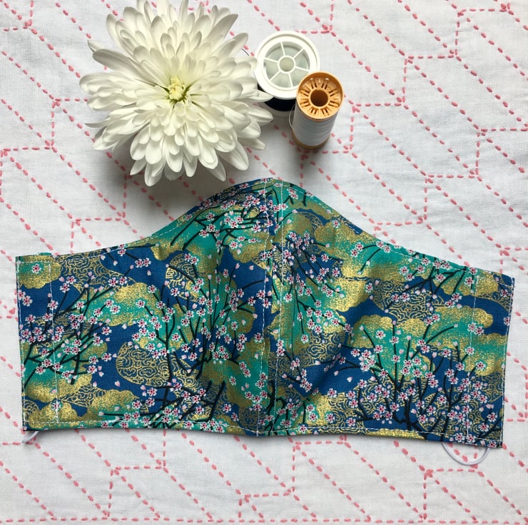 A pretty blossoms Japanese fabric in turquoise has been used to create this face mask. The fabric is 100% gilded high quality cotton. It has been lined with at least a 400 thread count cotton, which is soft against the skin. The mask is washable & reusable.