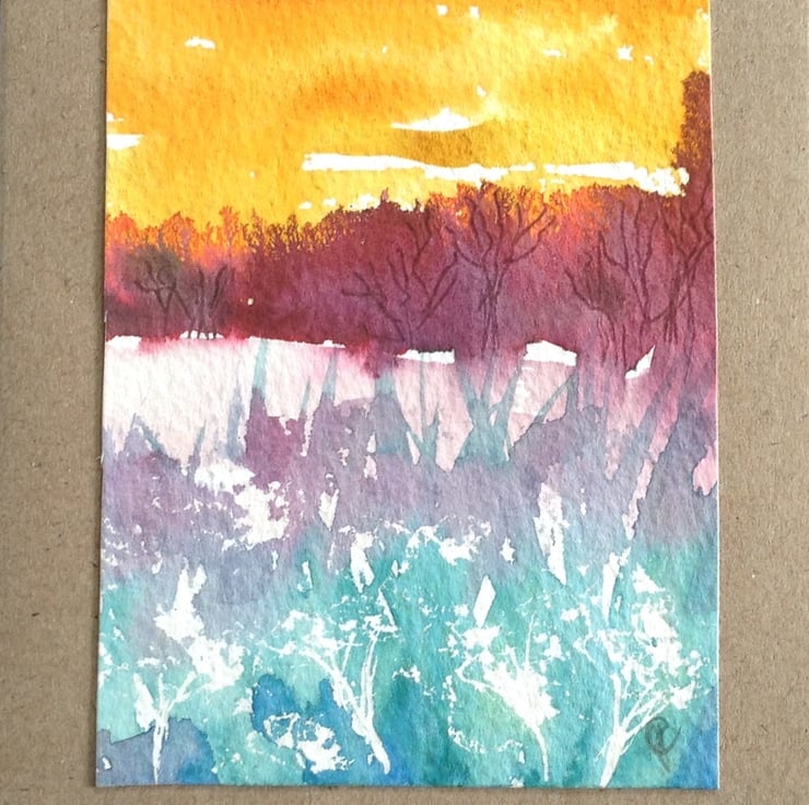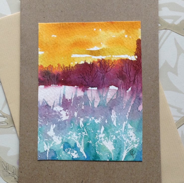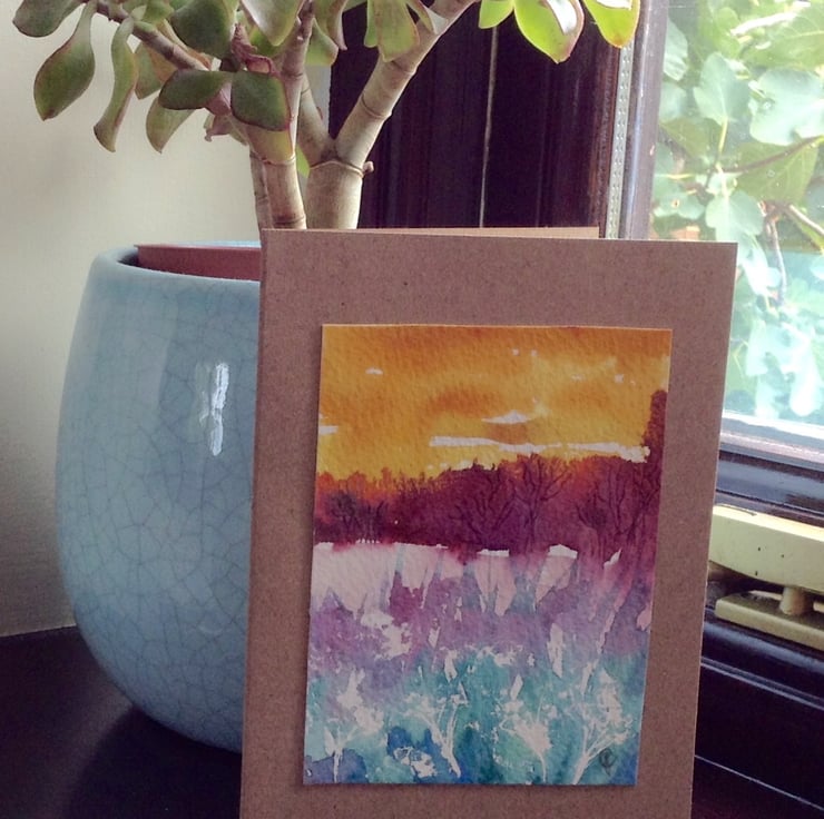This card has a small, semi-abstract sunsetl landscape original, painted in watercolour and attached to a brown card. The card is 10.5 x 14.8 cms and is blank inside for your own message, ideal for any special occasion. A beige colour envelope is included and it will be sent in a cello bag for protection. Postage is free to UK destinations.