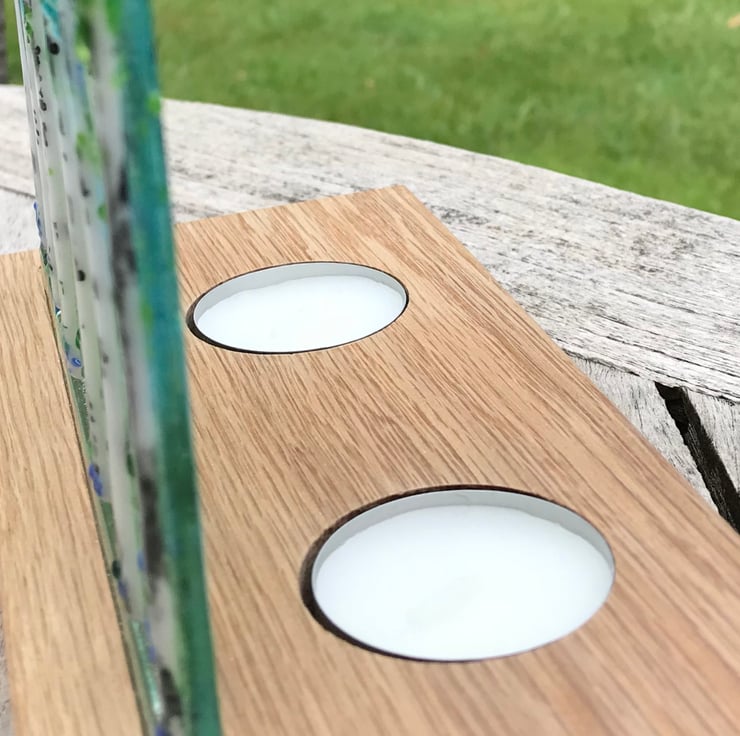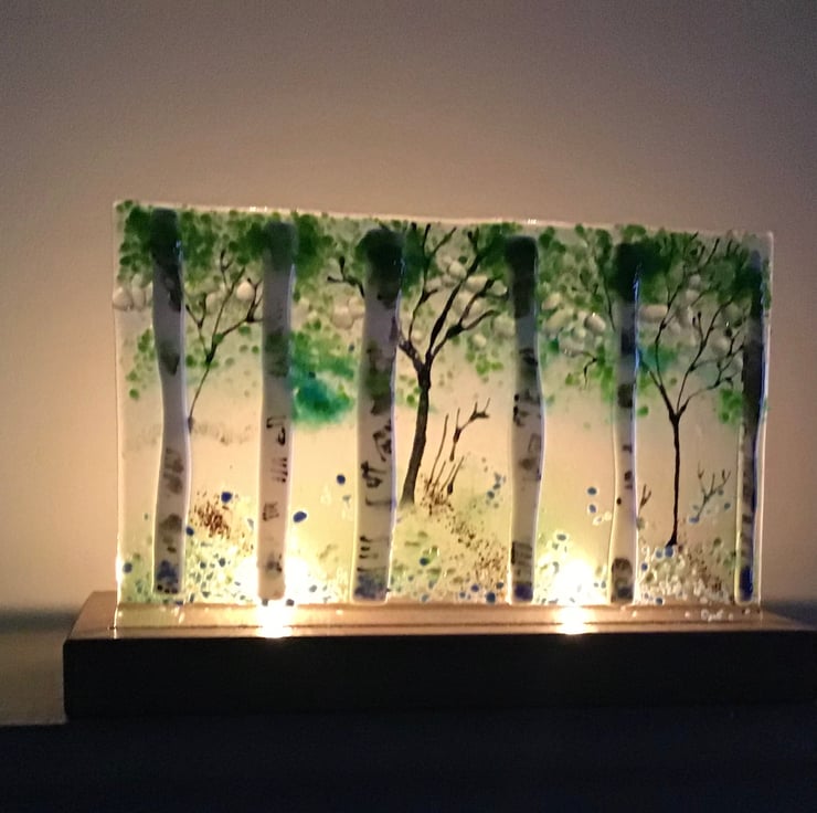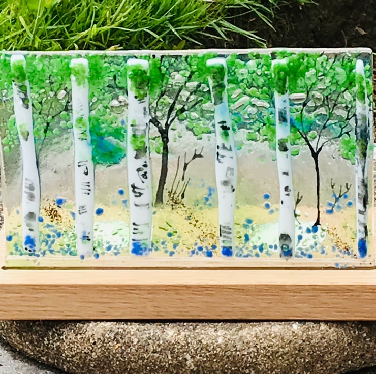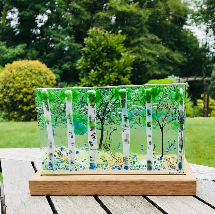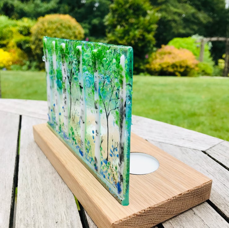 This one off fused glass silver birch landscape is set in an oak base with two candle recesses for tea lights . It’s a beautiful addition to any home . The glass panel easily detaches for ease of cleaning. It looks great day or night . The panel is smooth yet textural . It’s a functional ornament which adds a unique touch to your interiors
