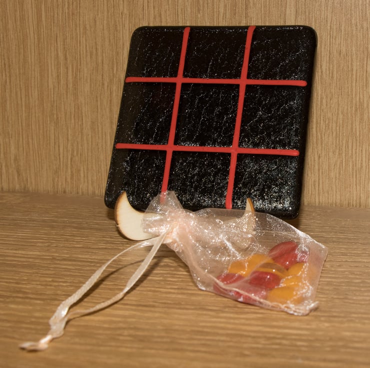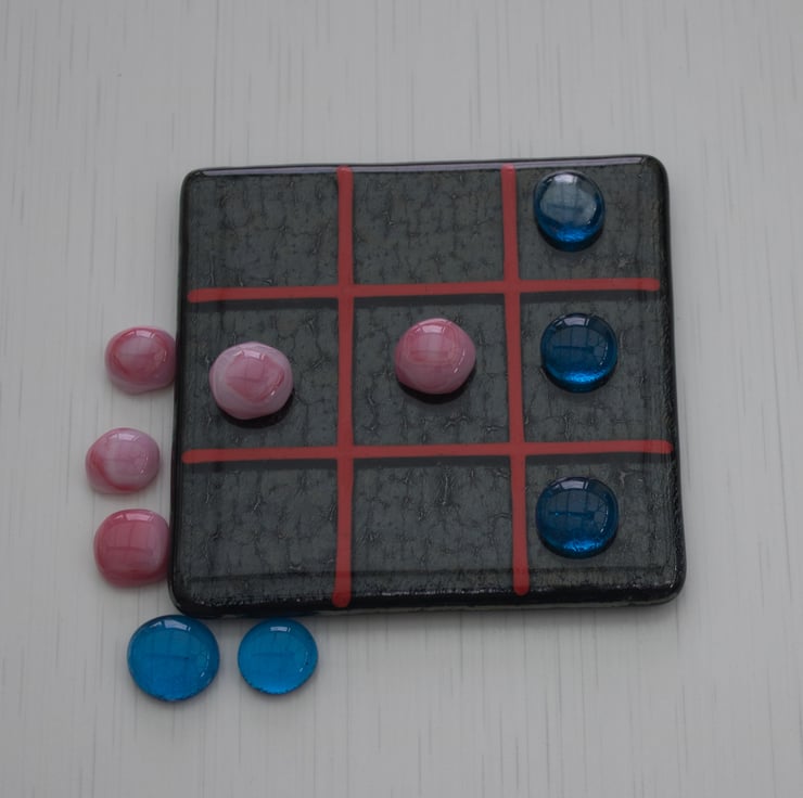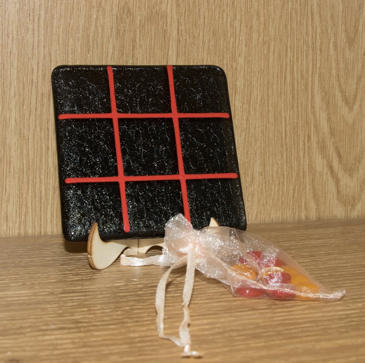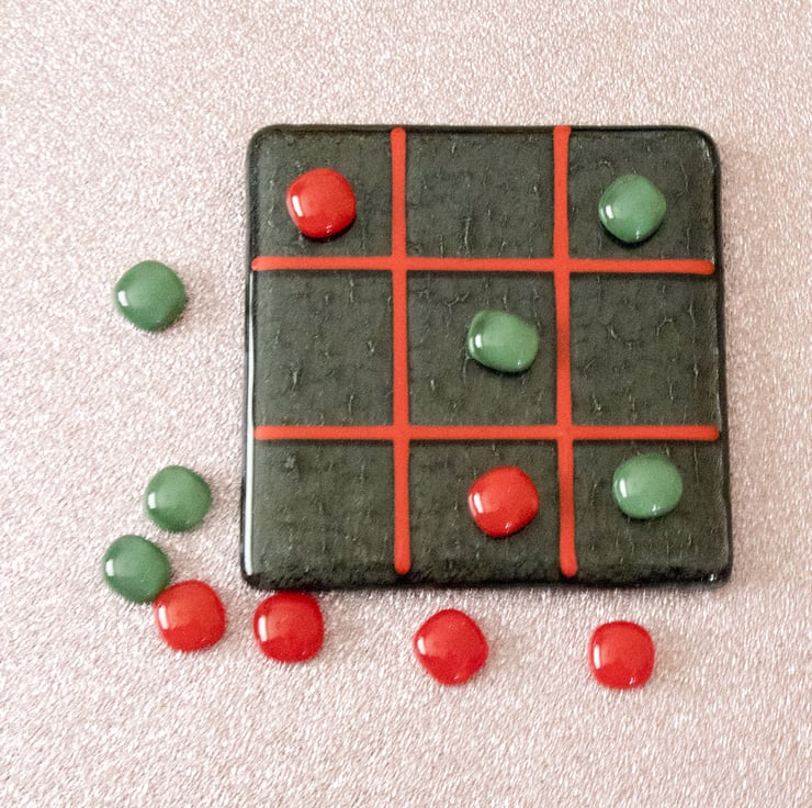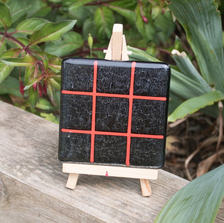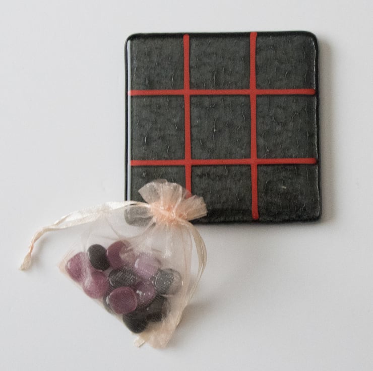 You won't need paper and pencil to play our version as we'll provide the grid on a 10 cm square coaster. The background is iridised black with the grid made from red stringers (thin glass rods).