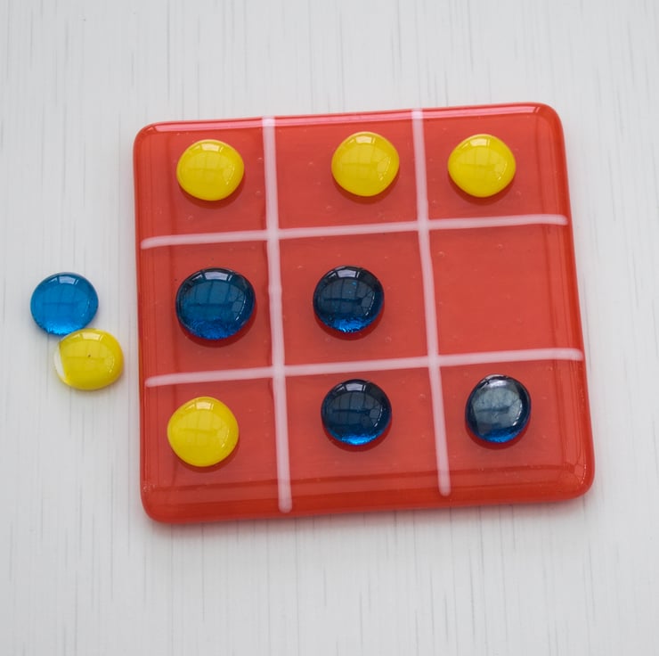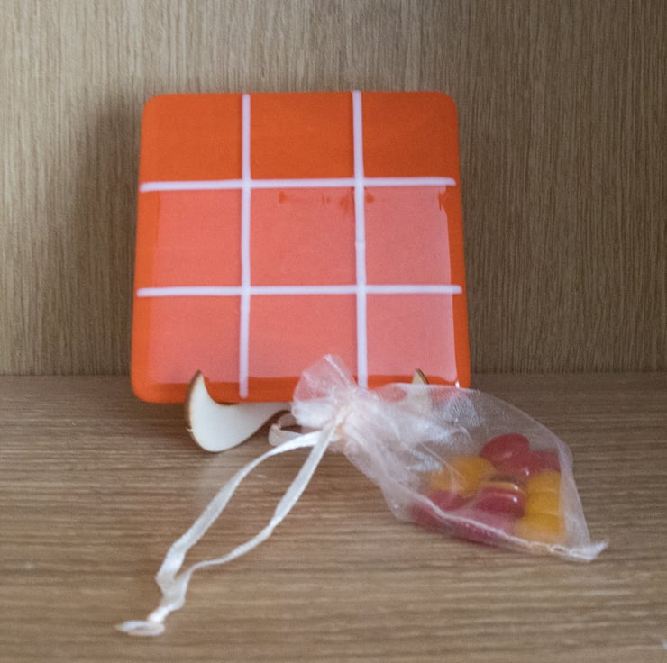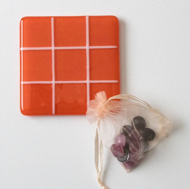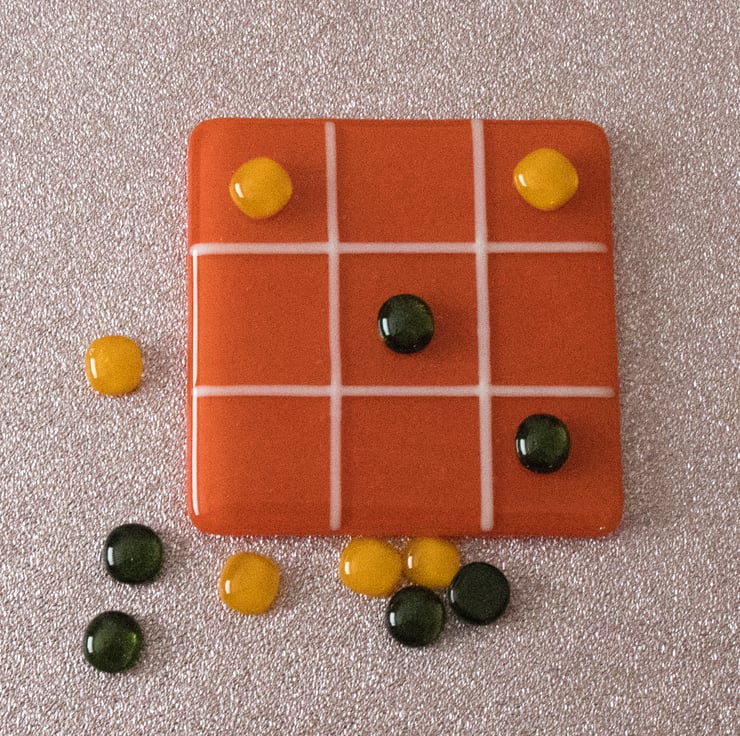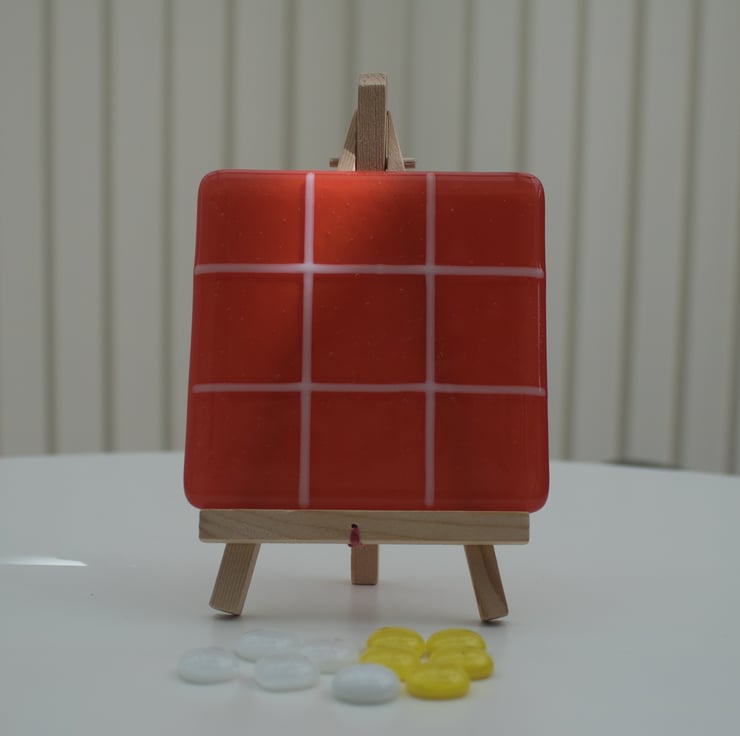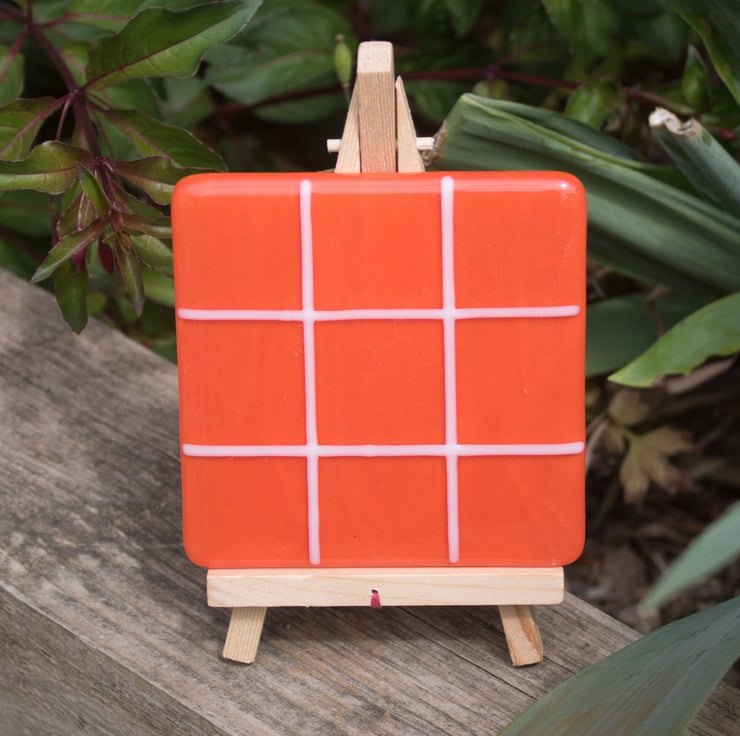 We use a 10 cm square coaster as the playing board. The background is orange with the grid made from white stringers (thin glass rods).