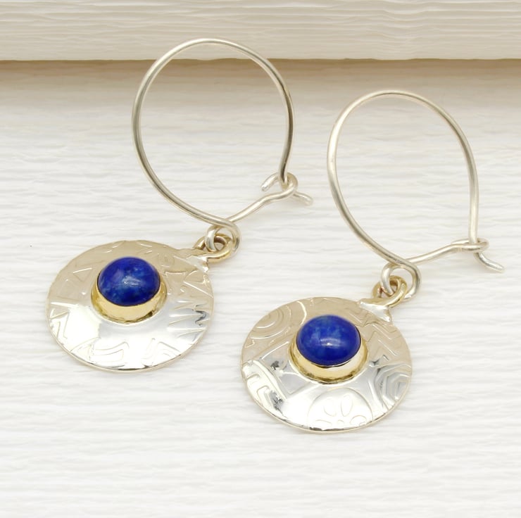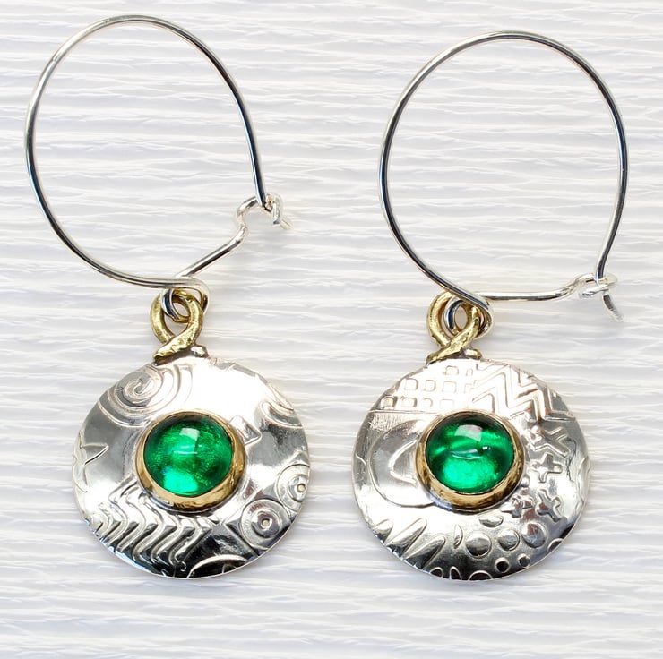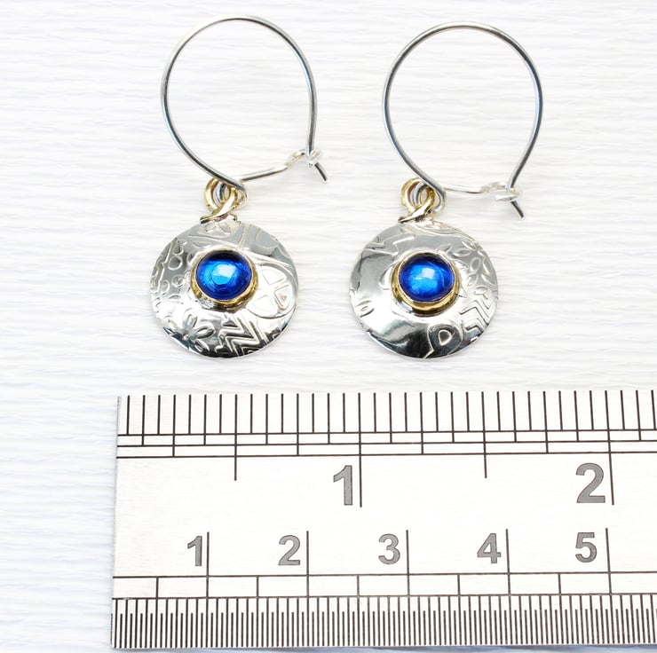 These handmade earrings are the smaller size of the two we make in our 'Round' range of jewellery. They are made from sterling silver and feature two garnet gemstones set in brass bezels, Garnet is the birthstone for January. We have designed and made the stencils and patterns embossed into the silver to create an interesting surface pattern. Because these earrings are handmade, the pattern will vary slightly on each pair, making them unique. They hang on sterling silver earwires, which we also make.