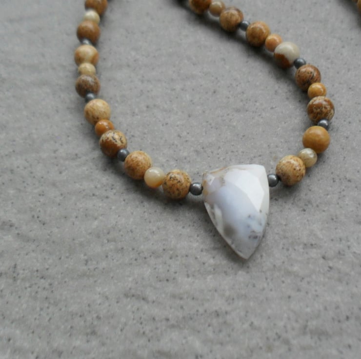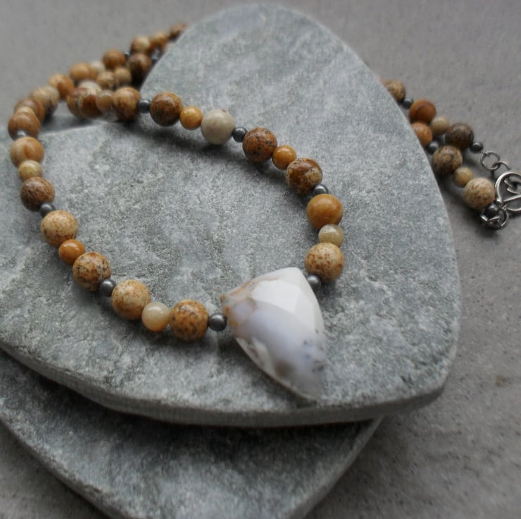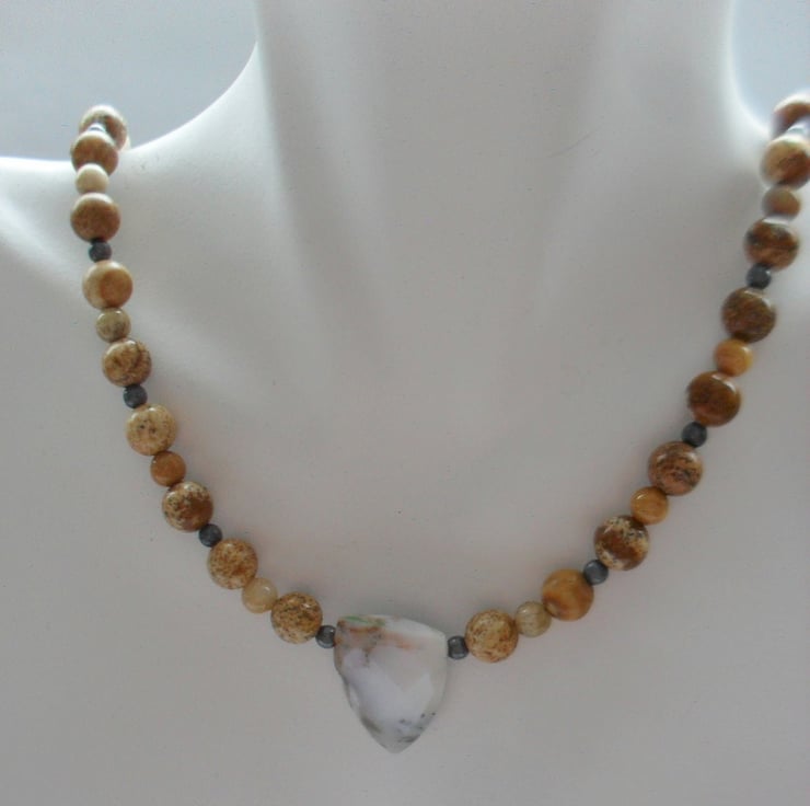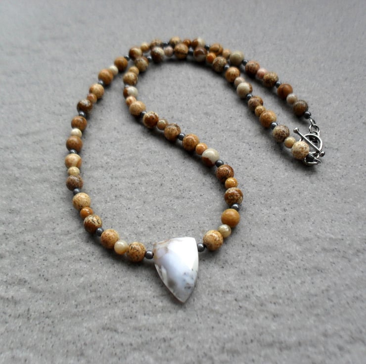 This necklace has been made with picture jasper and fossil coral round beads with tones of cream and brown,and a central dendritic agate semi precious gemstones. beads have been beaded onto beading wire and attached to a Bali silver toggle clasp.