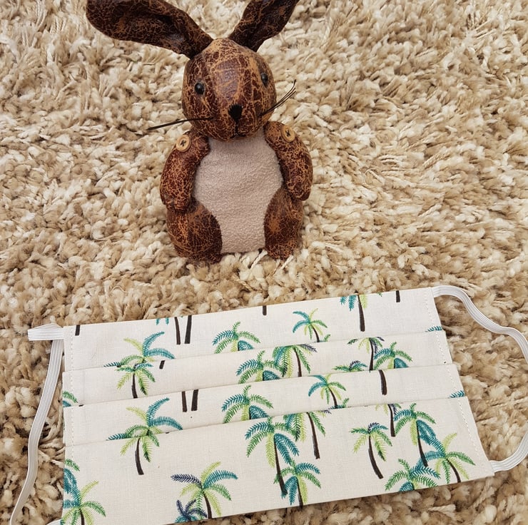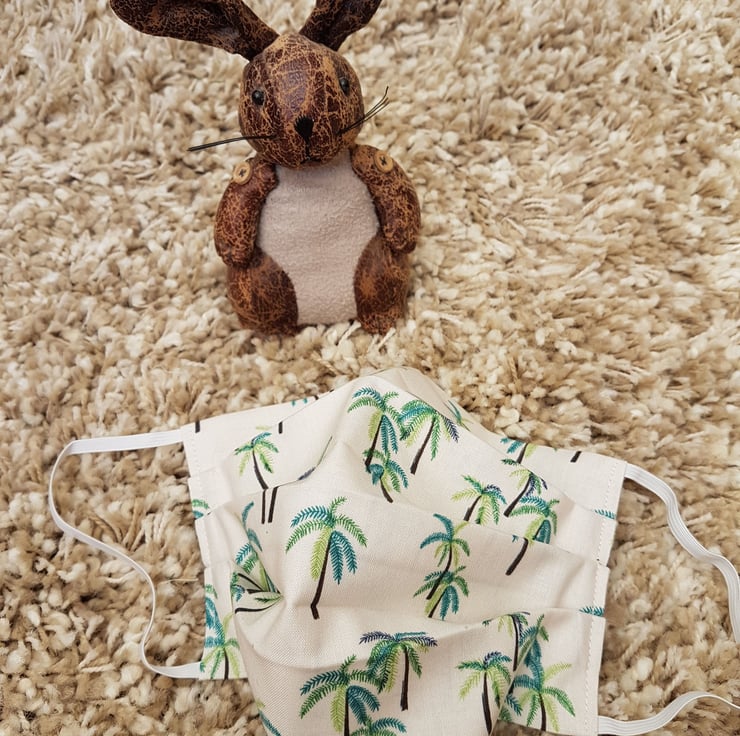 Adult face covering/mask made from a beige palm tree print cotton. The face mask is made with 2 layers of cotton forming an inner pocket for a filter (not included) and is fastened over the ears with 2 loops of elastic and a toggle adjuster.