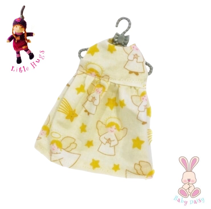 A cute little cotton nightie made especially to fit the Little Hugs dolls or baby Daisy. The nightie is made from cotton printed with little angels and has a lined bodice and gathered skirt. It fastens at the back with a little popper and comes on a cute little hanger.