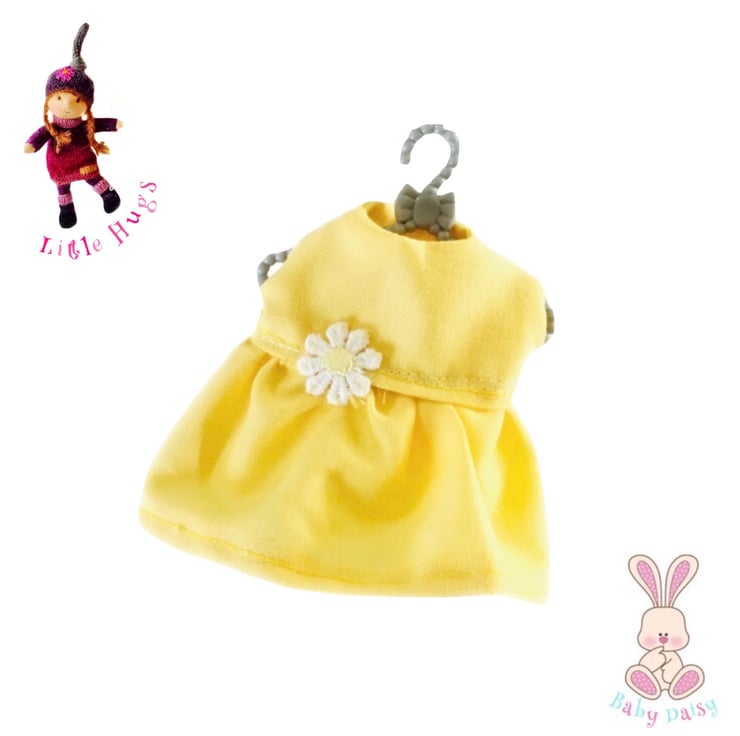 A cute little buttercup yellow dress decorated with a little daisy, made especially to fit the Little Hugs dolls or baby Daisy. The dress is made from cotton and has a lined bodice and gathered skirt. It fastens at the back with a little popper and comes on a cute little hanger.