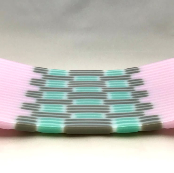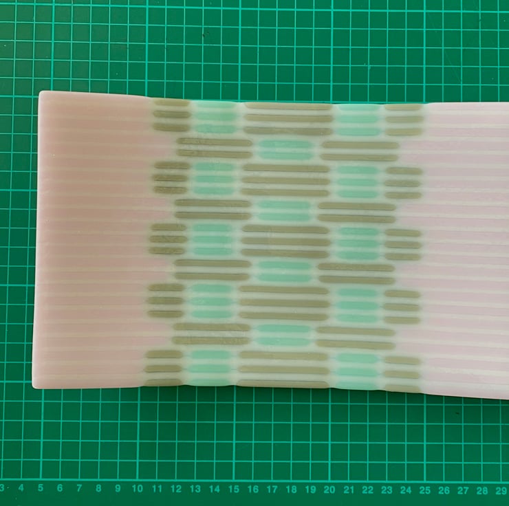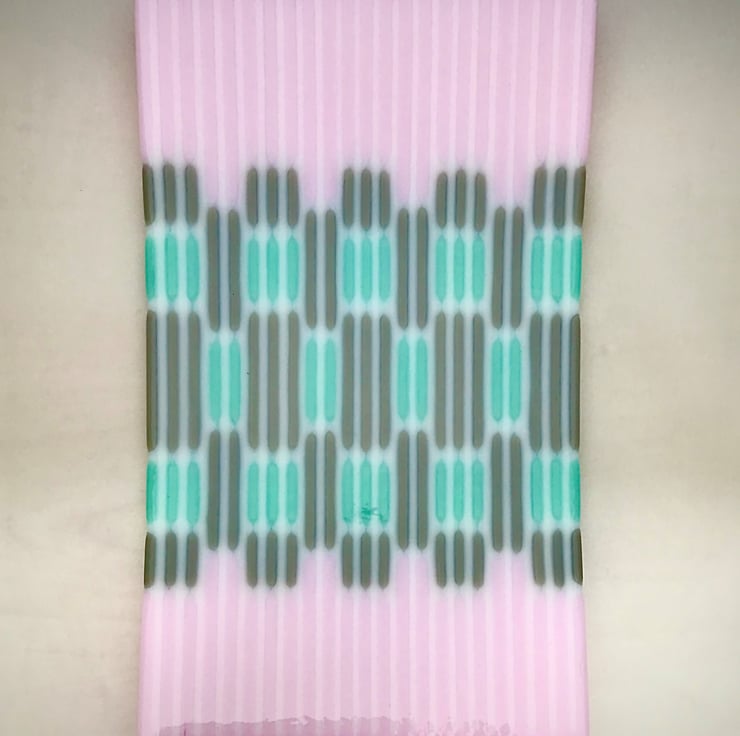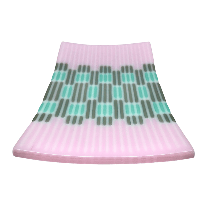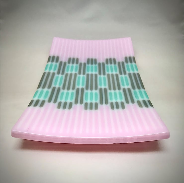 Bring soft elegance and artisan craftsmanship into your home with this Pastel Patterned Fused Glass Platter – a truly one-of-a-kind decorative piece. Carefully handcrafted using the intricate “Filling the Void” technique, this platter is made from 167 individually cut pieces of glass, each stood on edge to form a stunning block pattern in soft pink, robin’s egg blue, grey, and white.