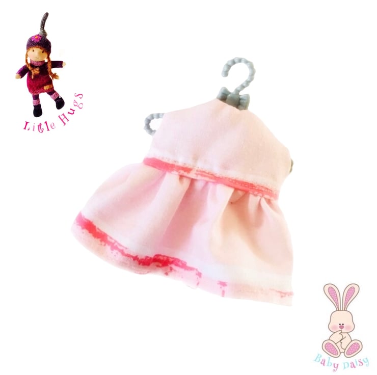 A lovely little pale pink dress made especially to fit the Little Hugs dolls or baby Daisy. The dress is made from cotton and has a lined bodice and gathered skirt. It fastens at the back with a little popper and comes on a cute little hanger.