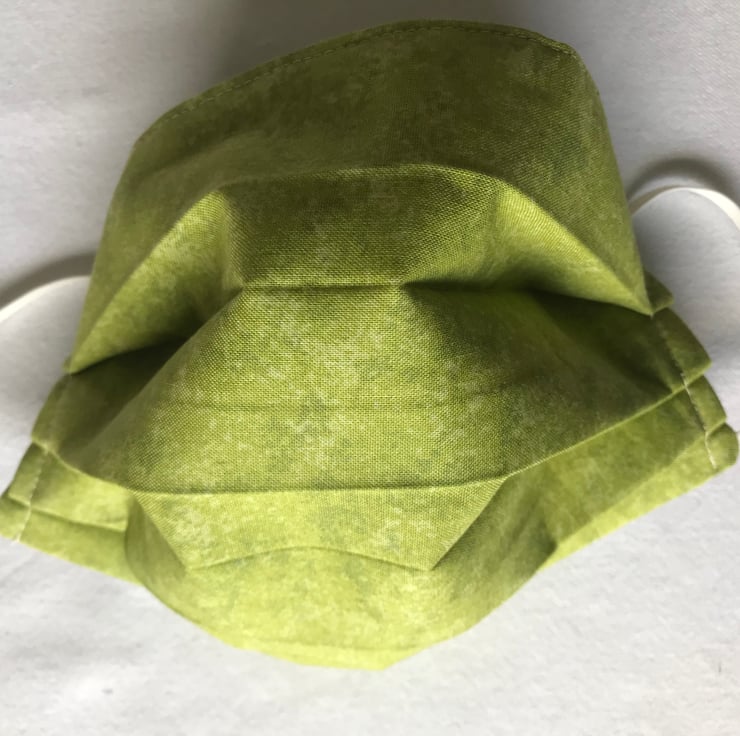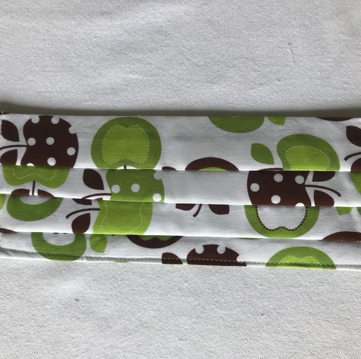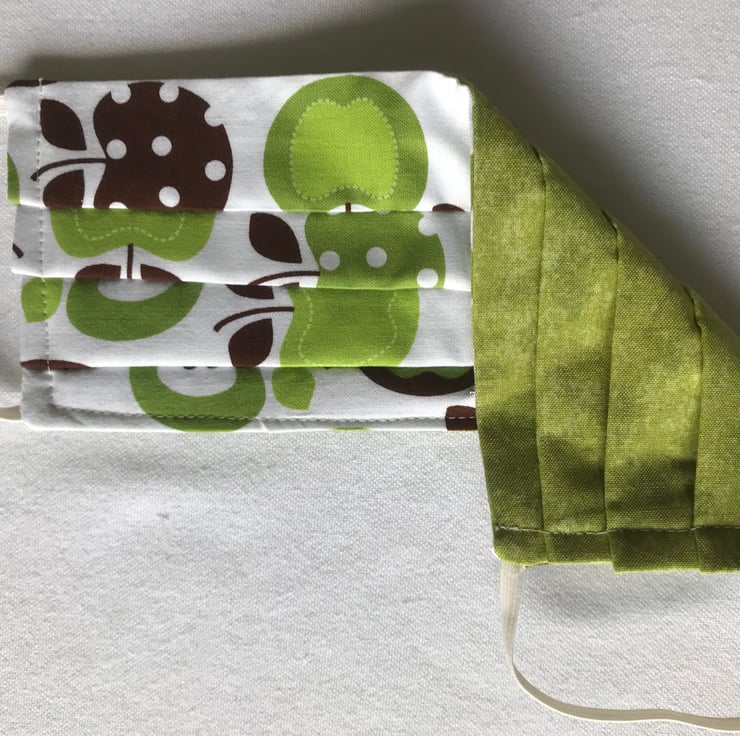 Double sided, this reusable face mask has a fresh looking apple design on one side and a green mottled pattern on the reverse. It can be worn either way.