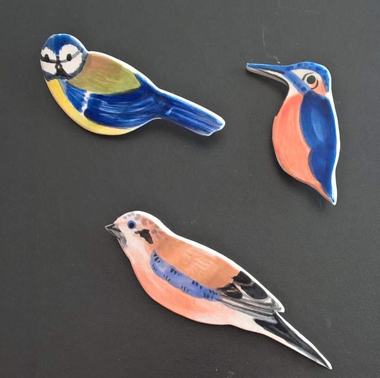 The process i use to make my brooches, includes two kiln firings, then I hand paint the brooch with an underglaze paint and then dipped into a transparent shiny glaze, to give it, it's final finish.